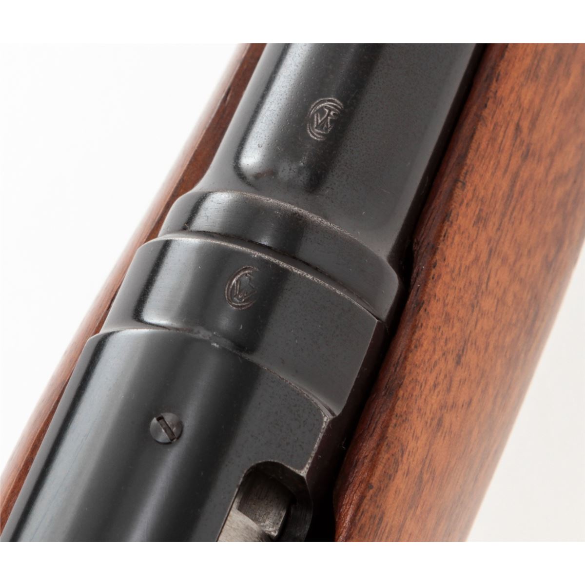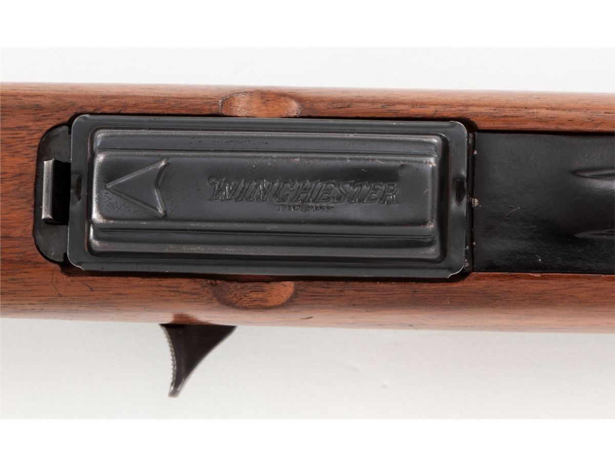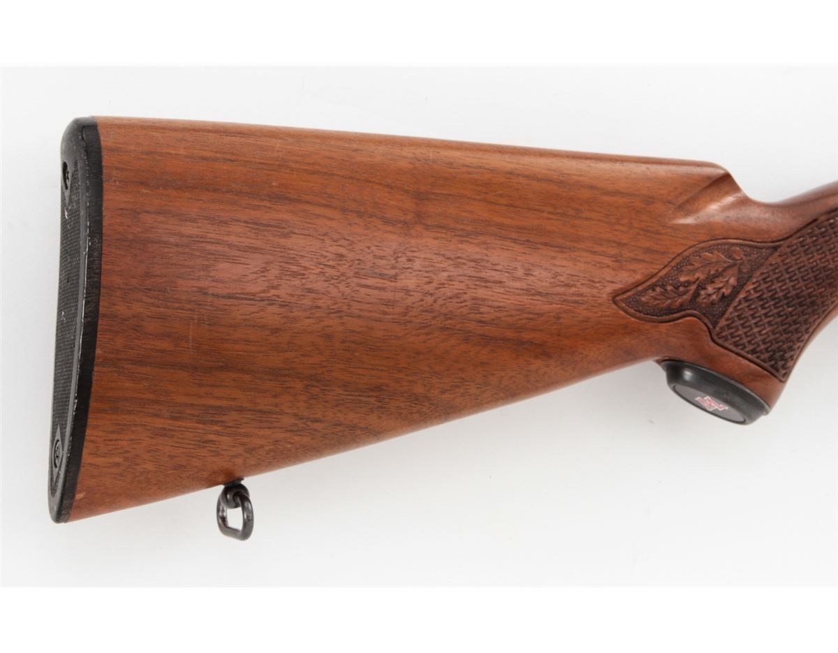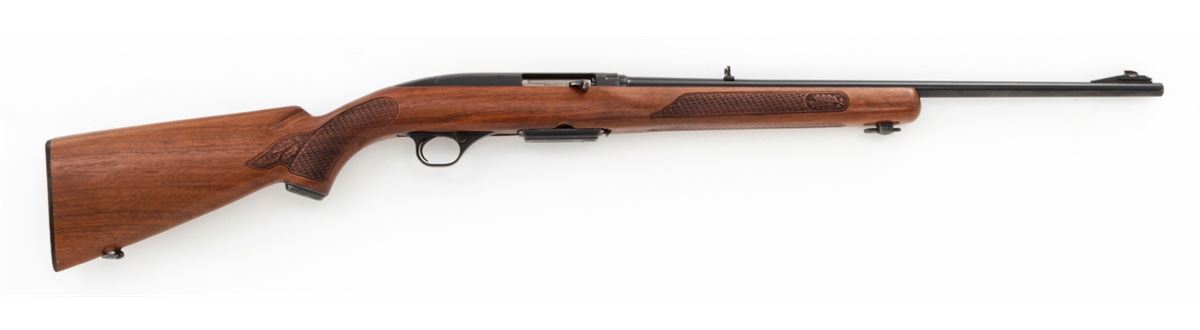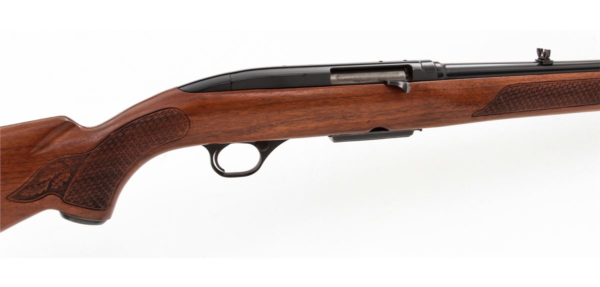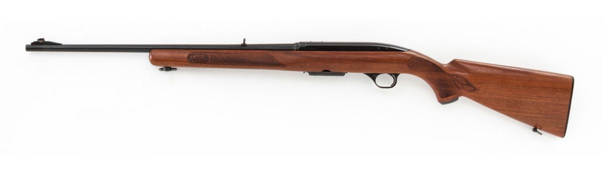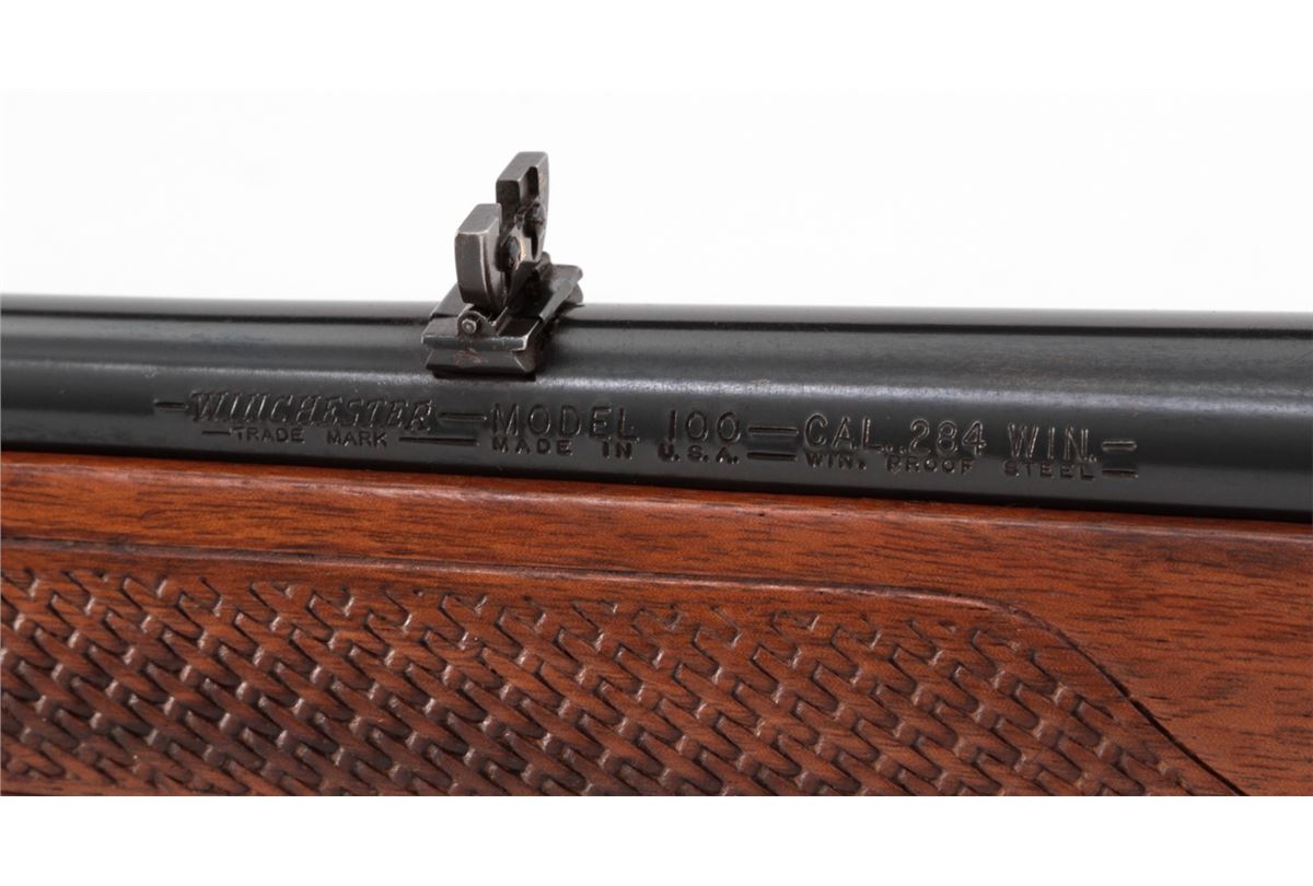 Winchester Model 100 Semi-Automatic Rifle, #133475, .284 Win. cal., 22'' barrel, blue finish, pressed checkered walnut stock, with one correct magazine. Mfg'd 1965. Condition is near excellent showing very light high edgewear and minor scuffs to stock. No front sight hood. Crisp action, bright bore. Scare in .284 Win. cal. Est.: $500-$750. (C&R)