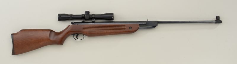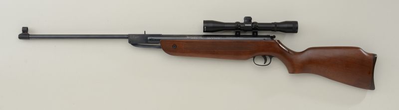 Winchester Model 1000X air rifle with Simmons 4 X 32 scope displaying fine optics, .177 cal., mat black finish, wood stock, #0902 01942. This gun is in overall excellent condition showing little use; fine bore.Est.: $75-$150.