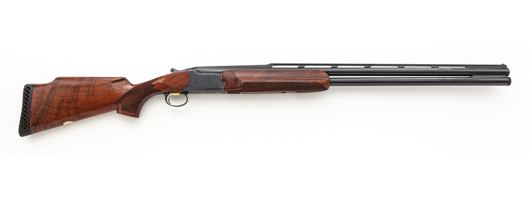 Winchester Model 101 ATA Hall of Fame Commemorative Trap Combo Set, #HF173E. Set includes two barrels: (1) 12 ga. 34'' single, ported, vent rib (upper) barrel, with 2-3/4'' chamber, fitted for Winchokes; and (2) 12 ga. 30'' over/under pair of separated barrels, vent rib, ported, 2-3/4'' chambers, with fixed Full choke on top and Winchoke below (five total tubes included). Action is standard Model 101, with single selective trigger, auto ejectors, and non-auto safety. Receiver is elaborately engraved, with the ATA Hall of Fame logo on one side and a pictorial of the building on the other, all surrounded by rose and scrolls. The full beavertail forend and Monte Carlo buttstock are Presentation Grade walnut, with fine checkering done at 24 LPI; length of pull is 14.5'' to Winchester Trap recoil pad. All items are contained in fitted Winchester case. Mfg'd approx. 1970. Condition is near excellent, with numerous small handling marks to buttstock, virtually no wear to bluing, and expected wear to action, which still locks tight and functions correctly; all bores are bright. Est.: $2,000-$2,500. (Modern)