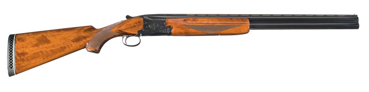 Produced in Japan between 1966 and 1984. Dual brass bead sights, with standard markings, skeet chokes, 2 3/4" chambers and ejectors. Floral scroll engraved frame and trigger guard, with a single gold trigger and tang mounted selective safety. Checkered pistol grip stock with a beavertail forearm, black grip cap and a Pachmayr White Line "Pigeon Shooter Pad" vented recoil pad. Length of pull is 14 1/2 inches.