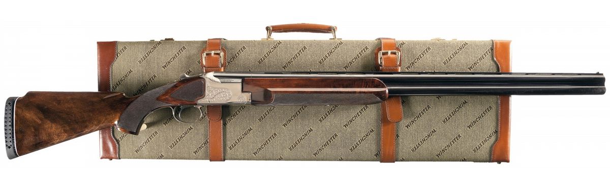 Introduced in 1974 and manufactured in Japan. Dual bead sights, 2 3/4 inch chambers, chokes marked full/improved modified, and ejectors. The receiver is scroll engraved with a pigeon and "WINCHESTER" on the bottom. The upper tang and trigger guard have a simple border engraving, and the rib is marked "PIGEON GRADE". Single trigger and tang safety/selector. Checkered forearm and high comb pistol grip stock with a vented recoil pad. Length of pull is 13 3/4 inches. Comes with a Winchester Grand European takedown case.
