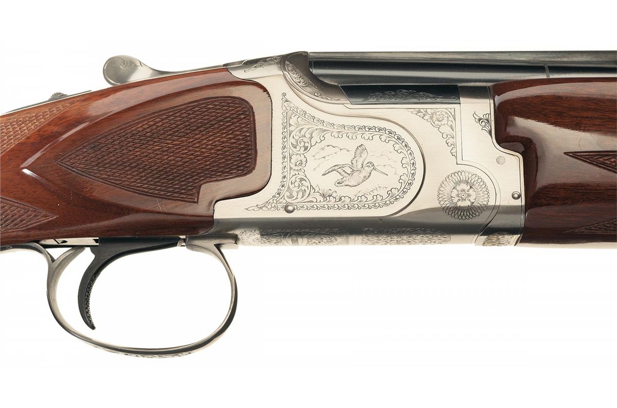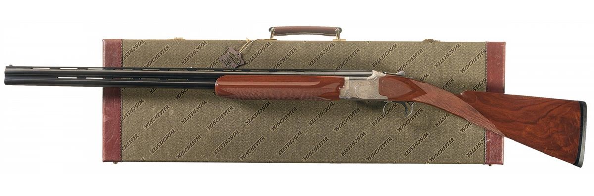 Manufactured in Japan. Dual bead sights, chokes marked modified and improved cylinder, 2 3/4 inch chambers and ejectors. Standard Winchester markings including the Pigeon Grade receiver engraving. Single trigger and tang safety/selector. Checkered straight grip stock and forearm with solid Winchester recoil pad. Length of pull is 14 inches. With Winchester takedown case.