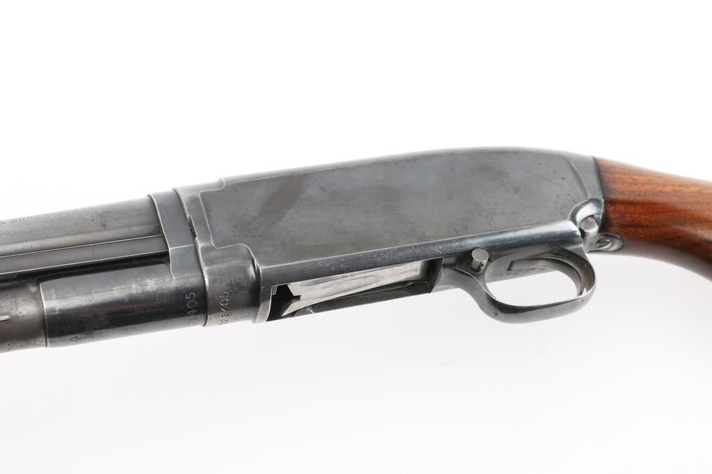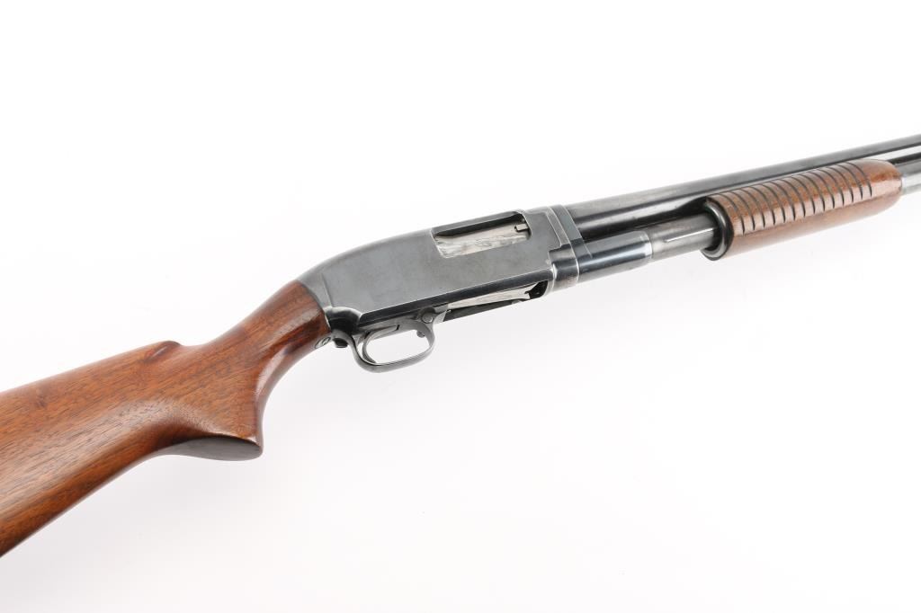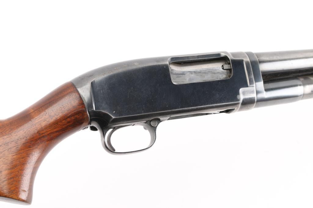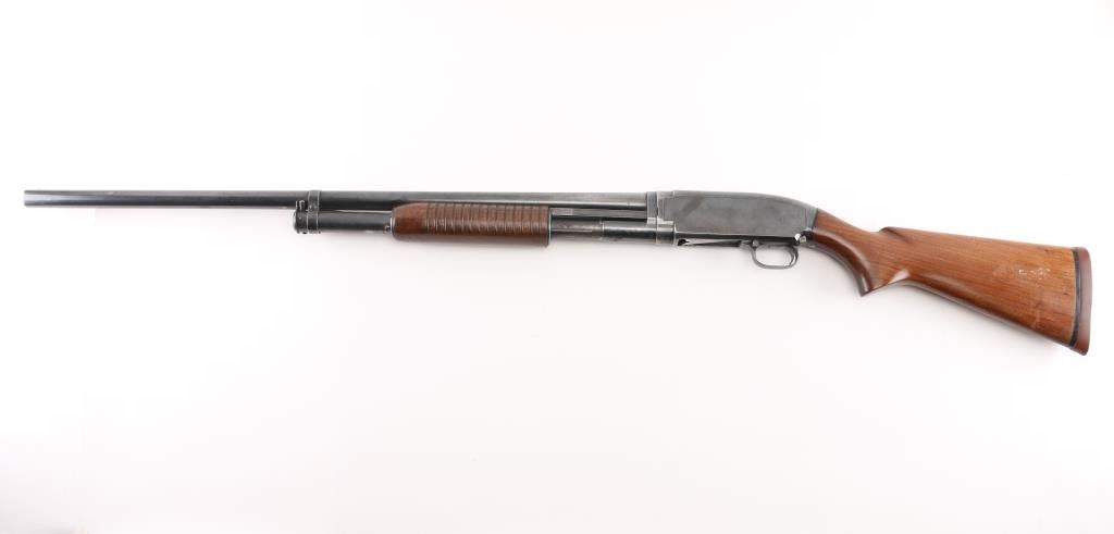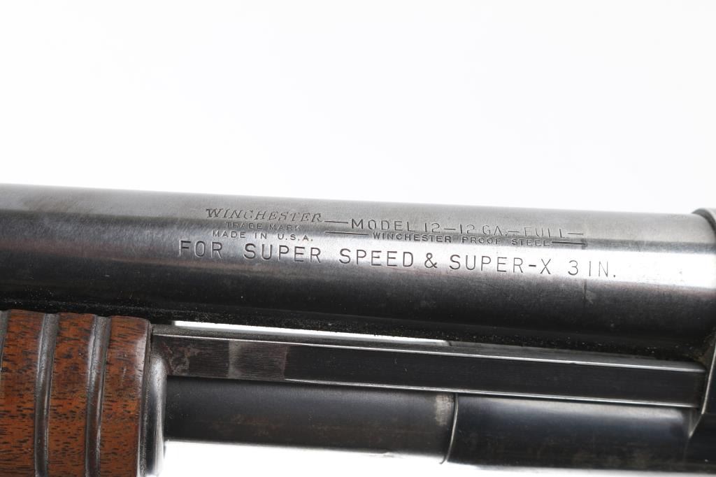 Vintage take down pump action shotgun manufactured circa 1955. Features 30" plain barrel, barrel marked "FULL" choke & "FOR SUPER SPEED & SUPER-X 3 IN", steel front bead, blued finish, smooth walnut semi pistol grip stock & grooved pump handle, red Winchester solid rubber recoil pad. (13 1/2" LOP), push button safety. Bore is very good, bright, needs cleaning. Retains 75% blue with thinning & bare metal from handling, scratches to receiver, small area of patina forming on mag tube. Wood is very good condition with dents and small scrapes. Numbers match on receiver & extension. Markings are crisp. Condition is NRA Very Good *** C&R Firearm ***