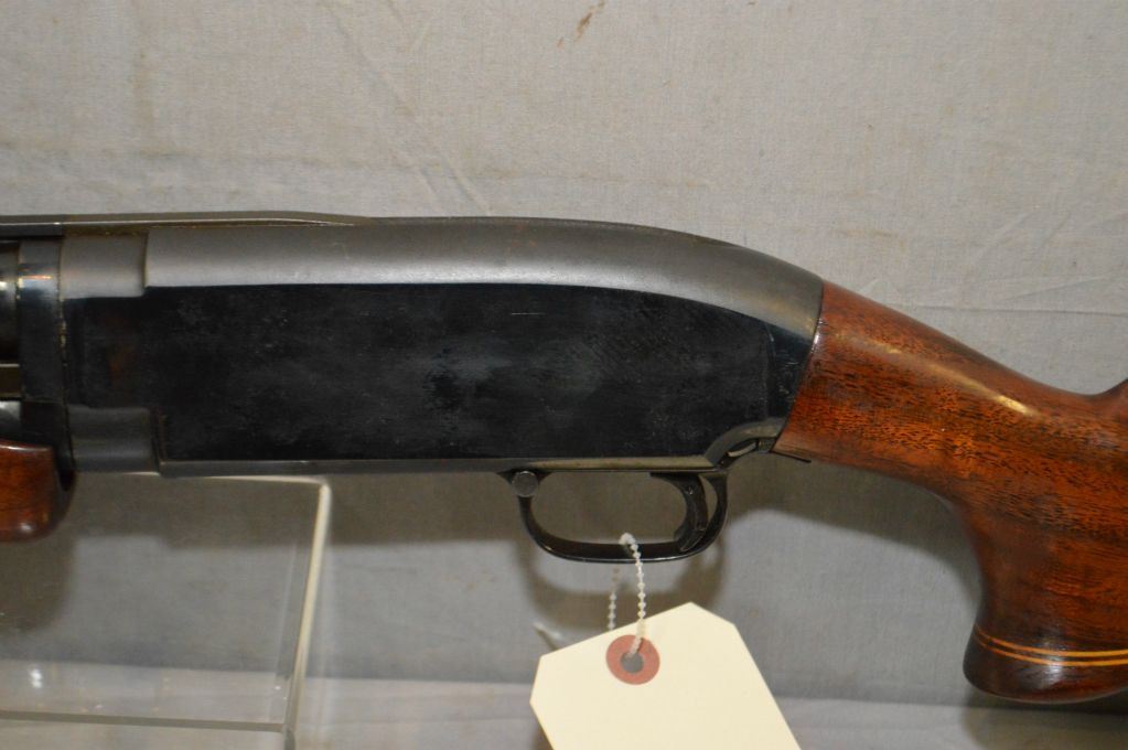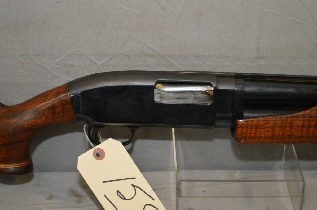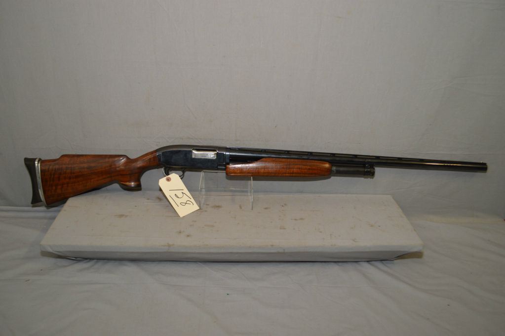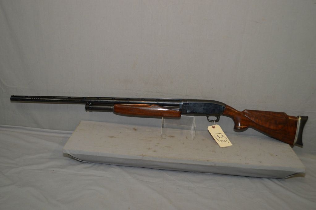 Winchester Model 12 .12 Ga 2 3/4" Pump Action Shotgun w/ 30" ported vent rib bbl [ old reblued finish, swollen walnut pistol grip stock & forend w/raised cheek piece, darker stained pistol grip cap, Morgan adjustable recoil pad, Circa 1950 ] Ser # 1223499