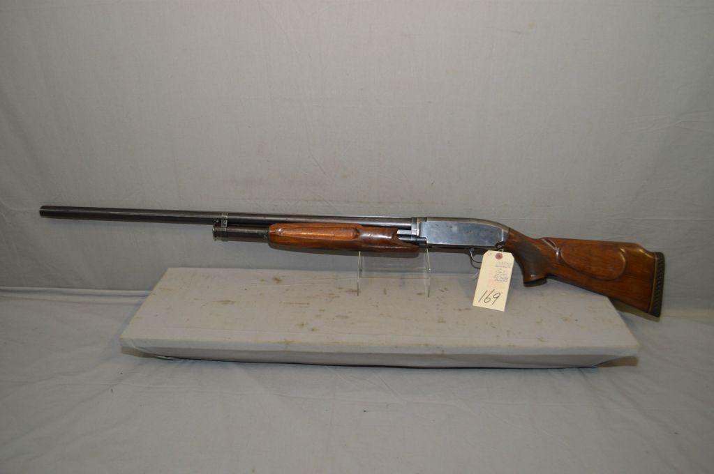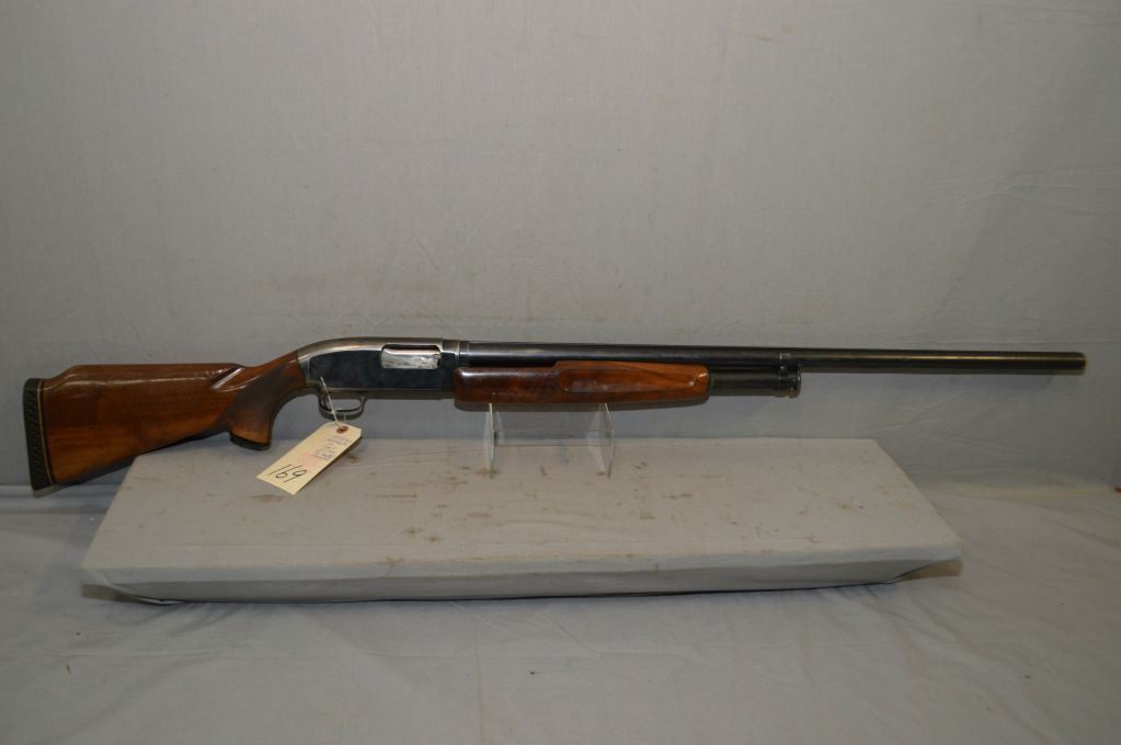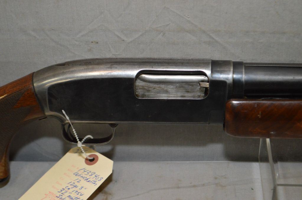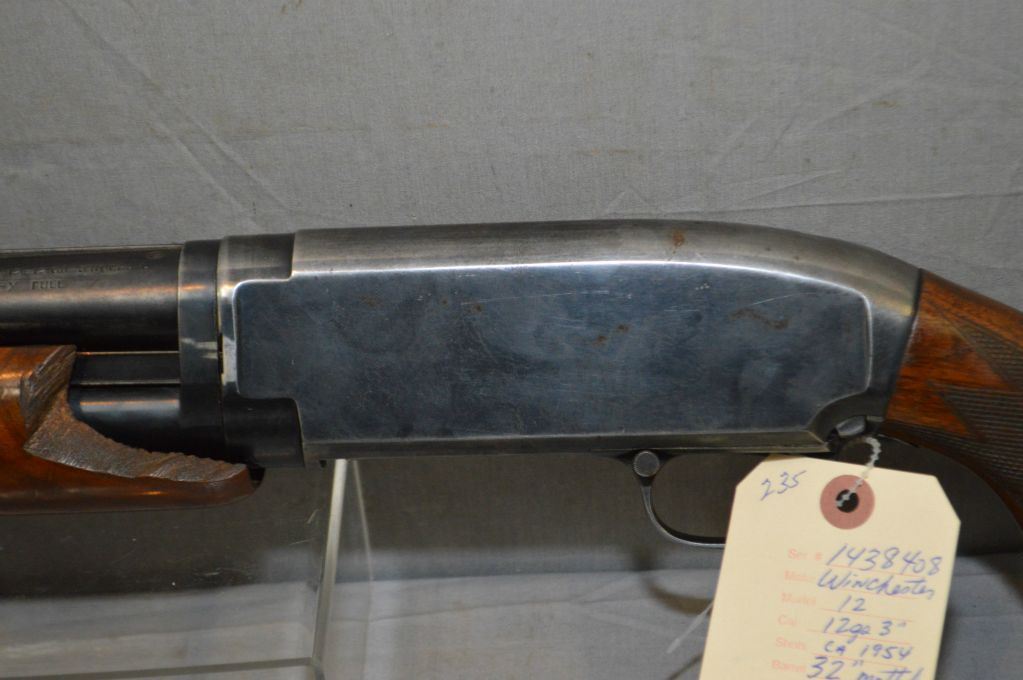 Winchester Model 12 .12 Ga 3" ( For Super Speed & Super - X ) Pump Action Shotgun w/ 32" solid matte rib bbl [ old reblue with some slight rust & pitting, checkered pistol grip stock w/ raised cheek piece, forend is checkered with large flutes, and large chip out of left side, Bishop recoil pad Circa 1954 ] Ser # 1438408