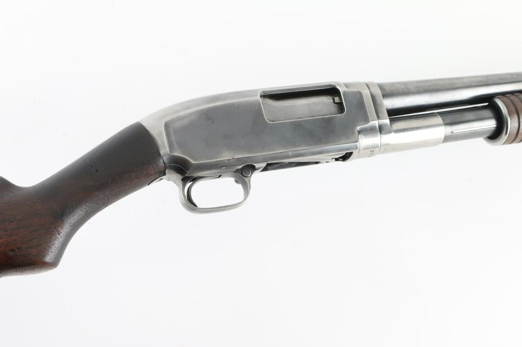 Vintage American made take down pump action shotgun manufactured circa 1924. Features 30" plain barrel, poly chrome adjustable choke attached to muzzle , brass front bead, blued finish, smooth wood semi-pistol grip stock & ribbed pump handle, factory rubber recoil pad, manual safety. Bore appears excellent/bright. Retains 30% finish with large bare metal areas, scratches, some darker bluing on barrel. Wood is very good condition with scratches, scrapes. Numbers match on receiver & extension. NRA condition-Good. C&R Firearm
