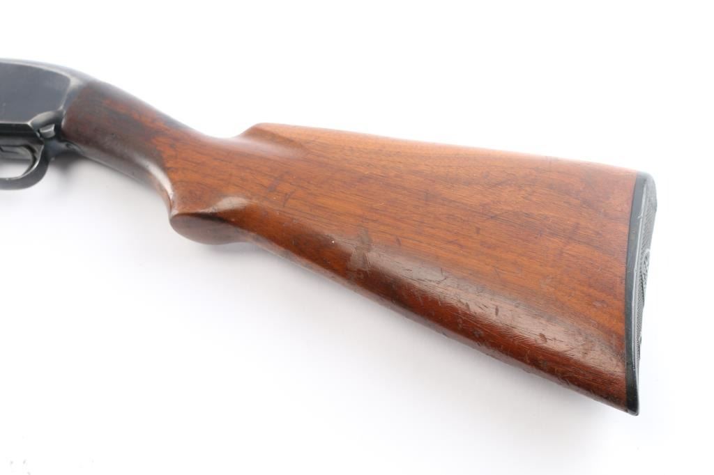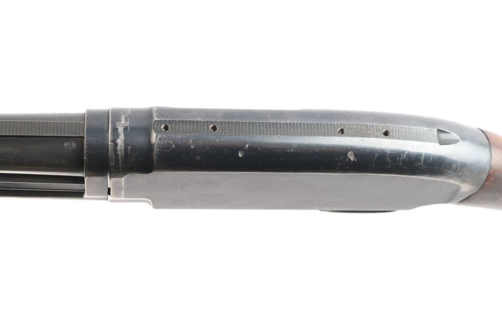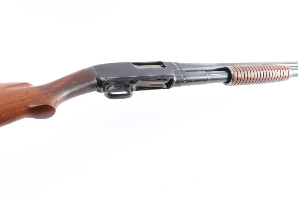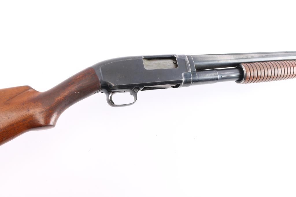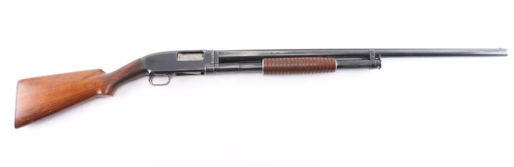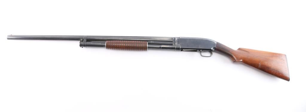 Vintage American made take down pump action shotgun chambered for 2 3/4" 12 gauge shells manufactured circa 1927 in New Haven, CT. It features blued finish, grooved "corn cob" walnut pump handle, smooth walnut stock with curved wrist, checkered factory black plastic buttplate, receiver drilled and tapped for optics, 30" ribbed barrel, fixed FULL choke (measures 'IM' with drop-in gauge), white front bead sight, rear white bead sight, and push button safety. Retains approximately 60% of its original finish with handling marks, edge losses, and scratches. Bore is bright, but a small dent can be seen. A mark left on the outside of the barrel is likely the cause of the dent . The wood is overall very good and sound with normal handling marks on the buttstock. The action is smooth and tight. Matching serial numbers on the receiver and barrel with sharp markings. The length-of-pull is 13 1/2". Drilling was done to the rib in a possible effort to add a sight bead.