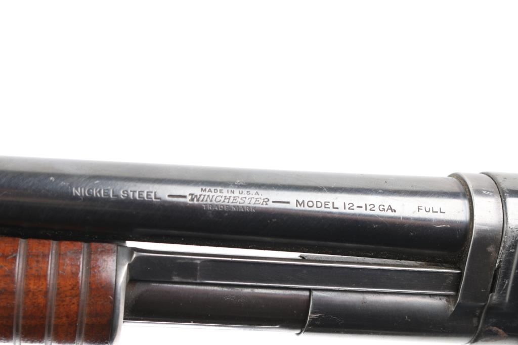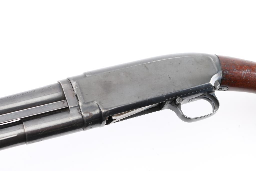 Vintage take down pump action shotgun manufactured circa 1927. Features 32" round barrel, barrel marked "FULL" choke, steel front bead, blued finish, walnut stock & pump handle, lined pump handle, Pachmayr recoil pad. (13 1/4" LOP), push button safety. Bore is excellent/bright. Retains 75% blue with handling marks & small scratches, rubbing wear where pump handle slides, light muzzle wear. Wood is very good condition with dents and small scrapes. Numbers match on receiver & extension. (Extension number is faint/readable). Action is smooth. NRA Condition-Good+. C&R Firearm.