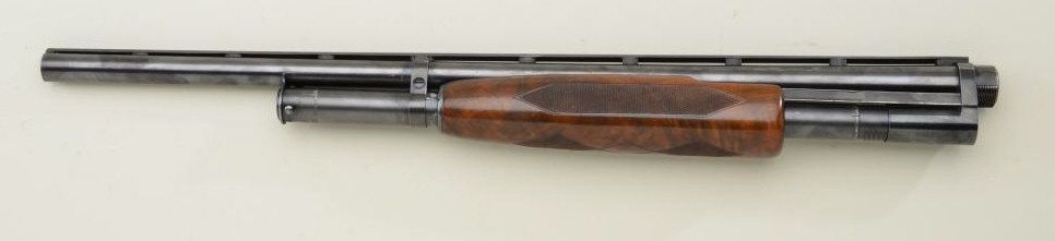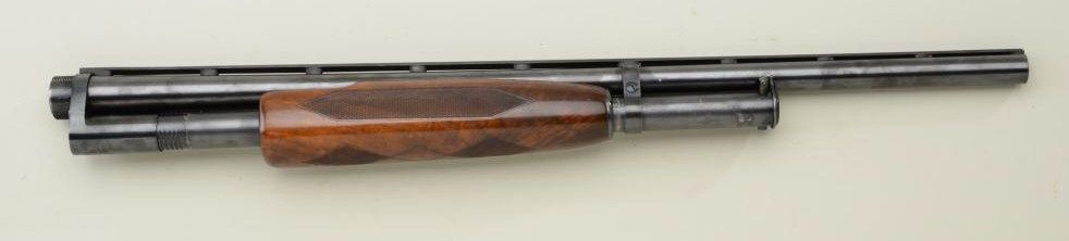 Winchester Model 12, 12 gauge barrel and front end. Serial #1358671 with pigeon marking, factory ventilated rib, 26" barrel. Choked WS2, correct checkered factory select wood fore end. 89-90% Blue. Bright boremissing front bead. Est.; $175-$350.Note: See lot 814 & lot 835