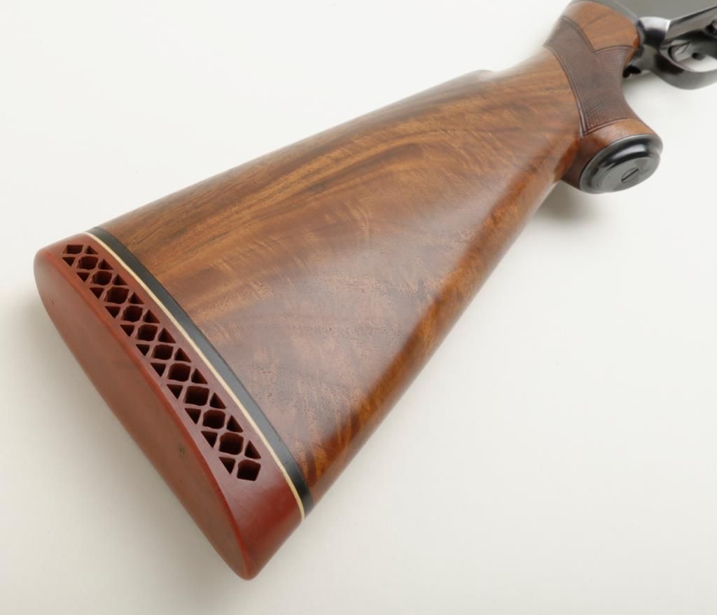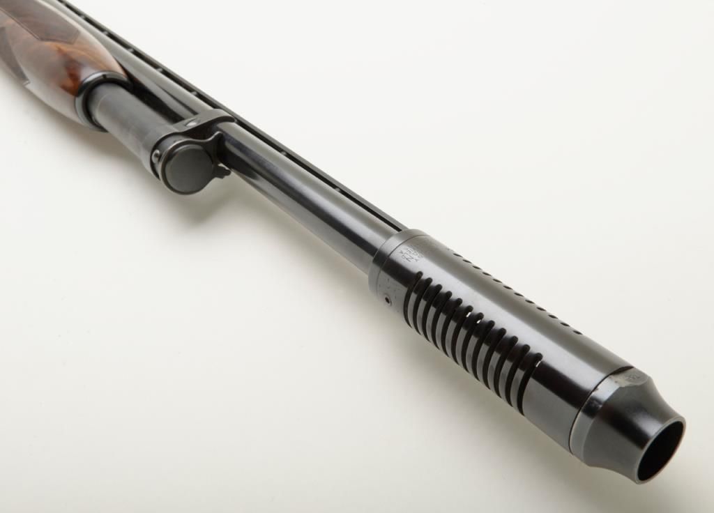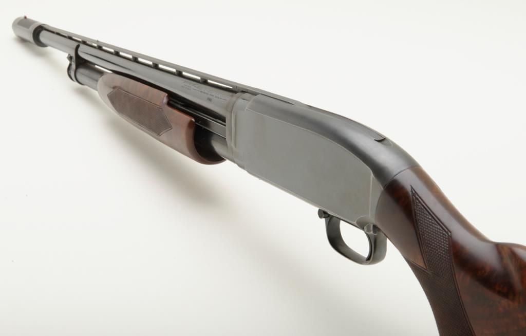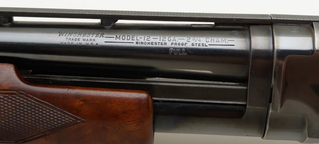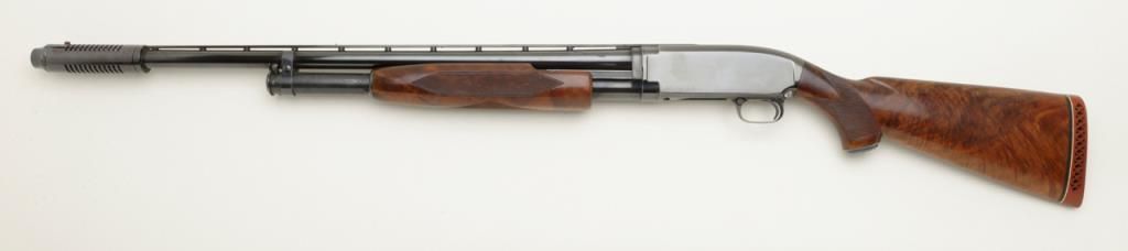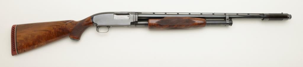 Winchester Model 12, 12 gauge pump action shotgun showing factory ventilated rib, Cutts compensator, and Pidgeon grade quality factory style checkered deluxe Burl Walnut stocks with blued pistol grip cap, serial number 1737911. The barrel measures 26 ½” to the end of the compensator and the barrel has been marked full for choke which is not a Winchester marking and probably marked by a gunsmith. The gun retains 90% to 95% original blue evenly thinning and toning at the edges. The action is crisp and the bore is dirty but will clean to very good or better. The stock measures 13 ¼” to the end of the wood and 14 1/8” to the end of the pad. Matching serial numbers and a very crisp and high-quality model 12 with pretty wood which is in very good condition. Est.: $400-$800