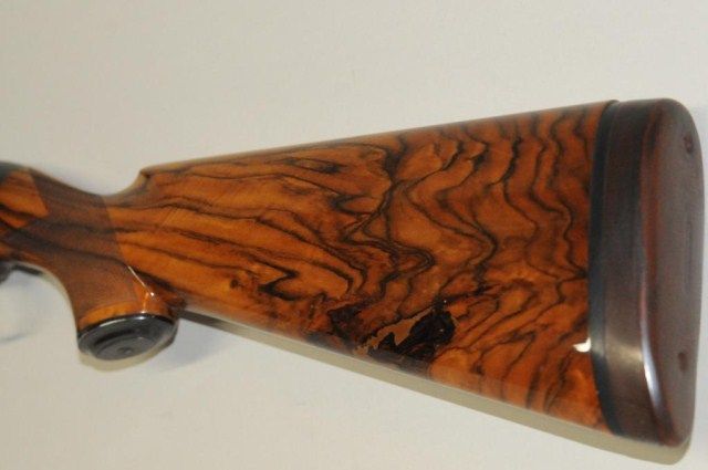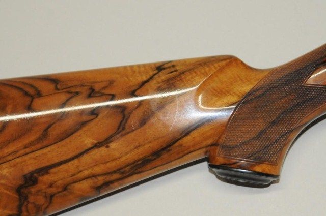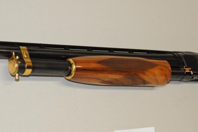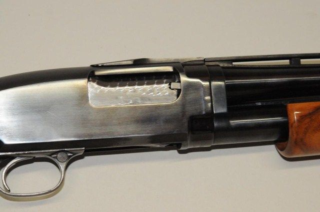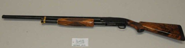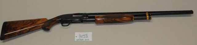 Winchester Model 12, 20 gauge factory skeet marked on bottom of frame and choked WS1. The gun shows a 26” barrel with factory ventilated rib, custom upgraded wood stock with gold plated trim and showing refinish at time of upgrade. Action good, bore good, wood near fine with accented grain on light colored stock, about 95-98% refinished blue. The stock measures 13-1/4” to the end of the wood, 14-1/8” to the end of pad. Serial#1066054. Est.; $1,400-$2,800.