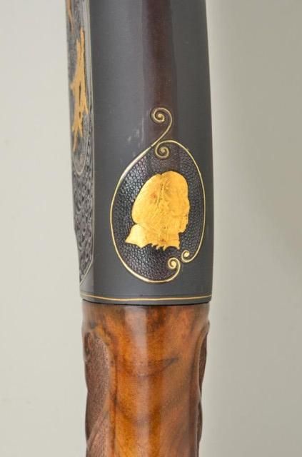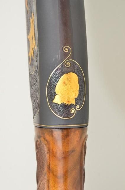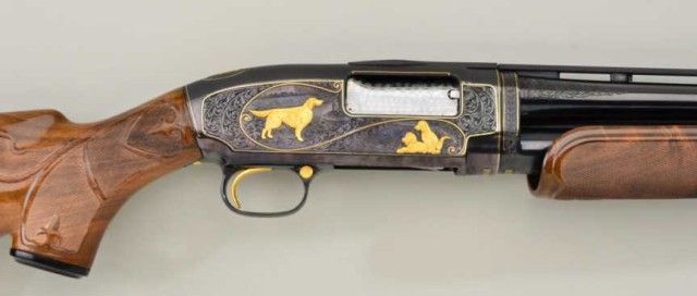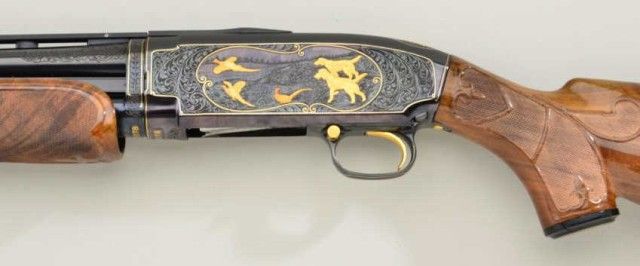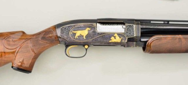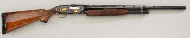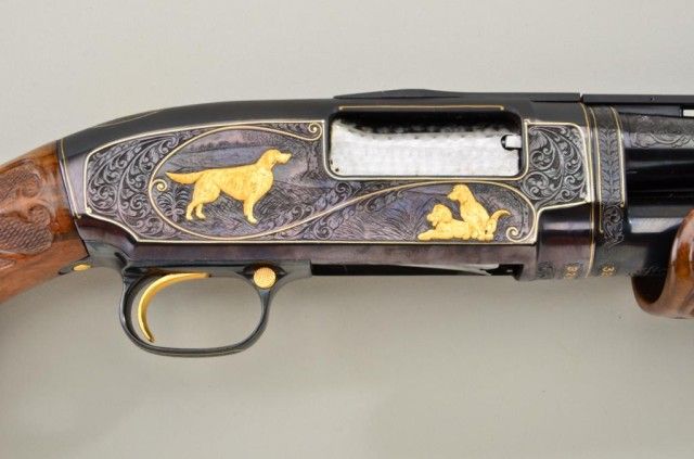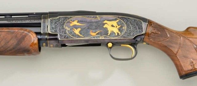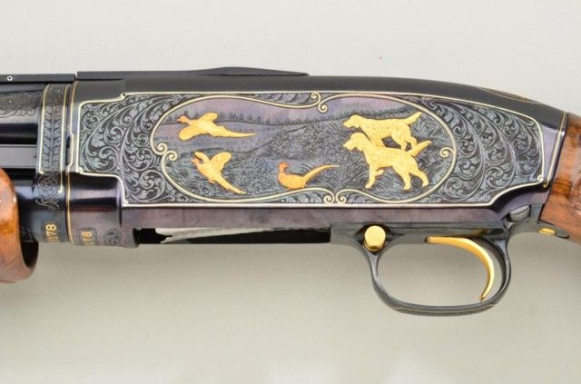 Winchester Model 12, 20 gauge pump action shotgun fully and finely engraved in gold inlaid by “Judge Cecil Mills” with deluxe checkered wood stocks and luggage case by “Arms Sport” serial #329178. This shotgunwas a labor of love created by the engraver for his personal collection and is signed on the left side of the frame in panel of hunting dogs, flushing birds. The engraving is accented by well cut deep scrolls andshows flush gold borders. There is a portrait of a hunting dog on the top rear of the frame and the right side of the frame shows two panels that are gold inlaid, one of dog on point and a smaller panel of twopuppies all surrounded by flush gold inlays and matching scrolls. The serial numbers are also flush gold inlay and the engraving extends onto the barrels with gold bands and numbers. The gun is stocked in select burlwalnut that is fancy checkered with fleur de lis borders. The gun shows a ventilated rib and matching numbered barrels, #1 barrel measures 28” and is full choked, #2 barrel measures 26” and is choked WS1. The gun has