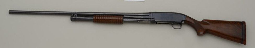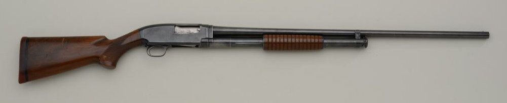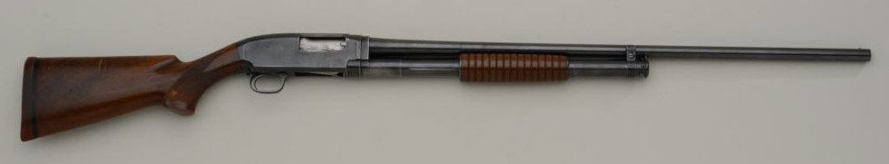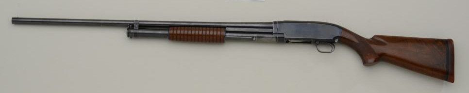 Winchester Model 12 20 gauge pump action shotgun marked for 2 ¾” shells on both barrel and frame in very good original condition, full choked, serial number 641521. The metal surfaces retain 50% to 70% original bluedrifting on the edges of the frame and operating areas of slide with some normal aging, toning and scratches. The stocks are good with slightly better grain then normally found and good checkering. Many minorscratches in the finish of the stock and a couple of major scratches. The gun shows a Winchester hard rubber recoil pad and measures only 12 9/16” to the end of the recoil pad and slightly less than 12” to theend wood. The markings are sharp and the action is good, bore very good and looks like it would clean to excellent as it is dirty. Est.: $400-$800