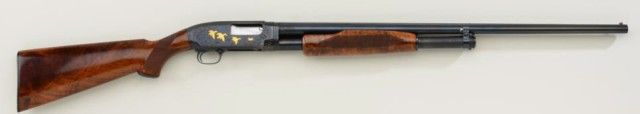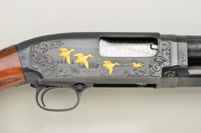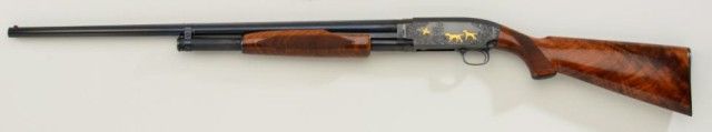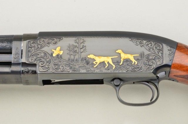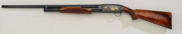 Winchester Model 12, 28 gauge conversion and upgrade with 28” barrel showing raised non vent rib, full choke, serial #1643634. The gun shows a factory influenced engraving pattern with 3 gold inlays on left showing 2hunting dogs flushing bird. The right side shows 4 gold ducks in flight over water and surrounded by classic scroll and border engraving. The stocks are checkered in a factory style pattern with select burl wood. The pistol grip cap and butt plate are Winchester marked. The stock measures 14-3/8” to the end of the butt plate. The condition is fine to excellent as restored with 98% plus finish on metal, some slightstorage and handling on wood. The quality of the conversion, engraving, stocking and remarking is very good and the gun is attractive in unmarked good quality luggage type case with canvas cover. Est.:$2,500-$5,000.