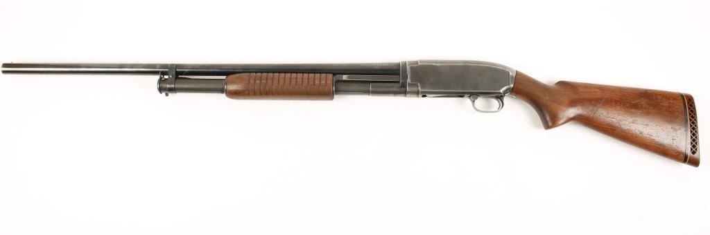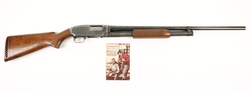 Pump-action shotgun with a blued 27" barrel with modified choke and 2-3/4" chamber. Barrel retains original patina, but has some scratches on the right side of the barrel. Receiver and magazine are blued, but only retain approx. 60%. Action is in good working order. Stock has several nicks, dings, and scratches. The bore is very shiny and smooth. Comes with original 1957 pricing manual/ catalog. **CURIO & RELIC**