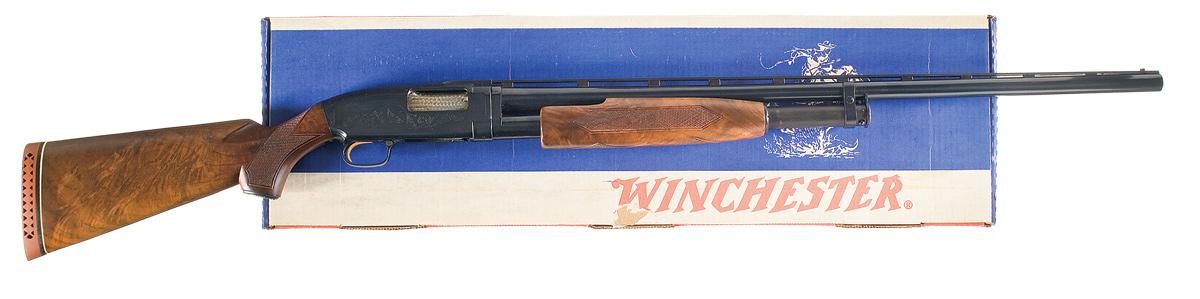 Double bead sights on a matte vent rib barrel, 2 3/4 inch chamber, choked full. Simple scroll engraved receiver with raised Ducks Unlimited gold medallion on the left side and a circled duck on right. Semi-fancy checkered forearm and pistol grip with Winchester grip cap and vented Winchester recoil pad. Gold washed trigger and jeweled breechblock. With box numbered to gun and papers.
