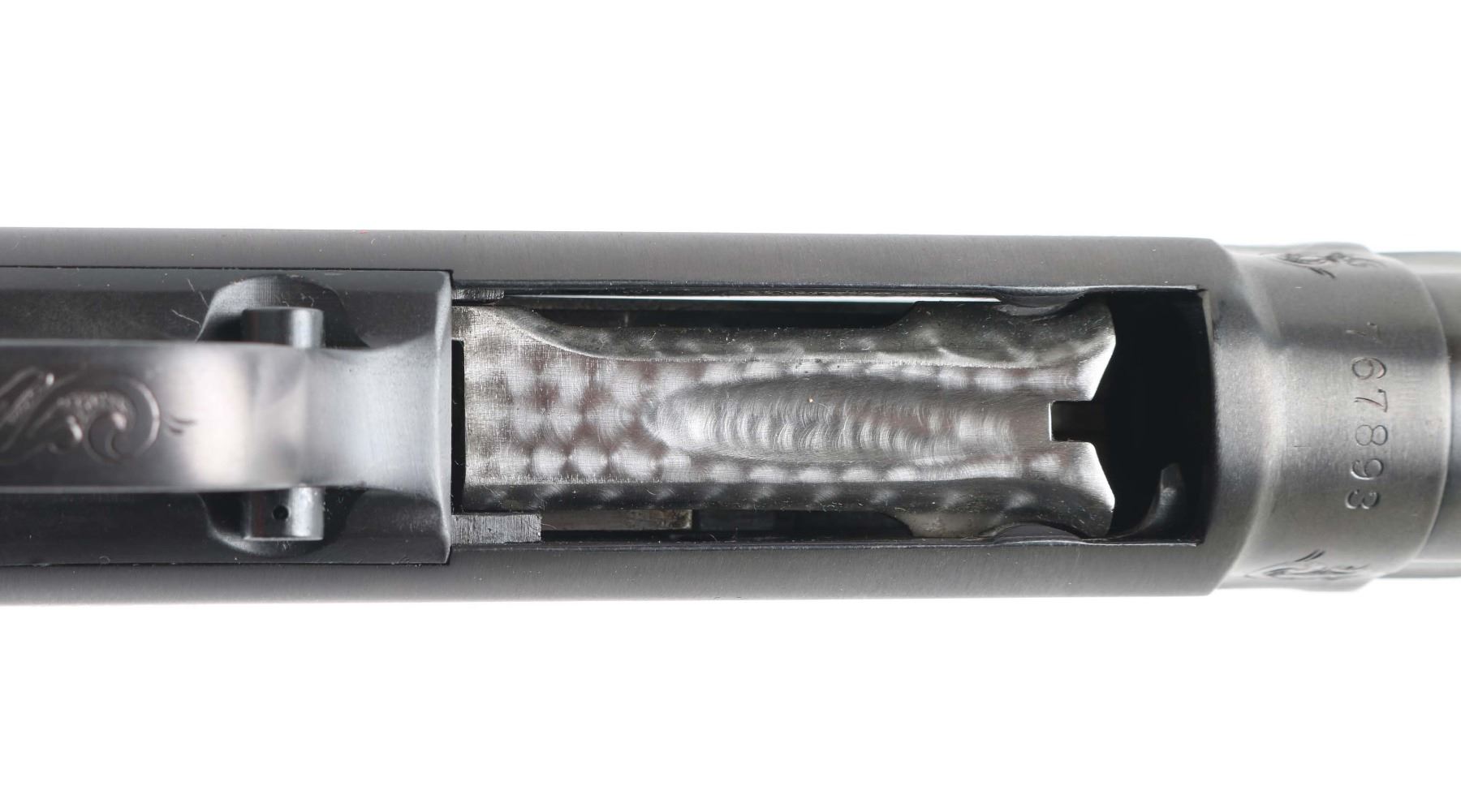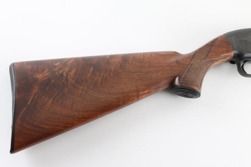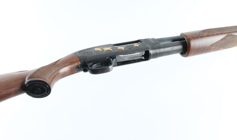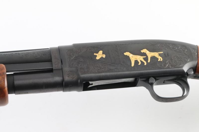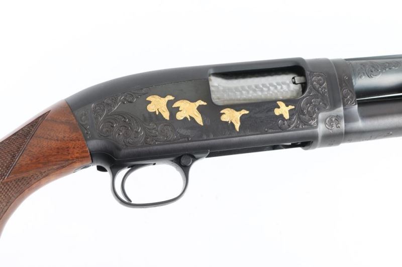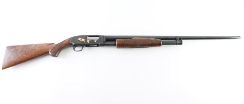 SN: 767893 Take down pump action shotgun manufactured circa 1938. Entire gun appears carefully refinished. Features blued finish, floral scroll engraving with gold inlaid animal scenes, fancy highly figured select walnut throughout, checkered pump handle, curved grip stock with checkered wrist, plastic buttplate, 28" solid rib barrel with fixed FULL choke, marked for 2-7/8" shells, empty threaded hole for a front bead, steel mid bead, polished & jeweled bolt and cartridge lifter, manual safety. Overall condition is excellent with few blemishes and handling marks. Bore is very good condition. Wood stocks are excellent with a few small dings to butt. Serial numbers match on receiver & receiver extension. Pigeon engraved on bottom of receiver extension. Pump handle is loose - appears the locking collar needs tightening. Some loss of depth on barrel letters from polishing. Condition is NRA Excellent (as refinished) *** C&R Firearm ***