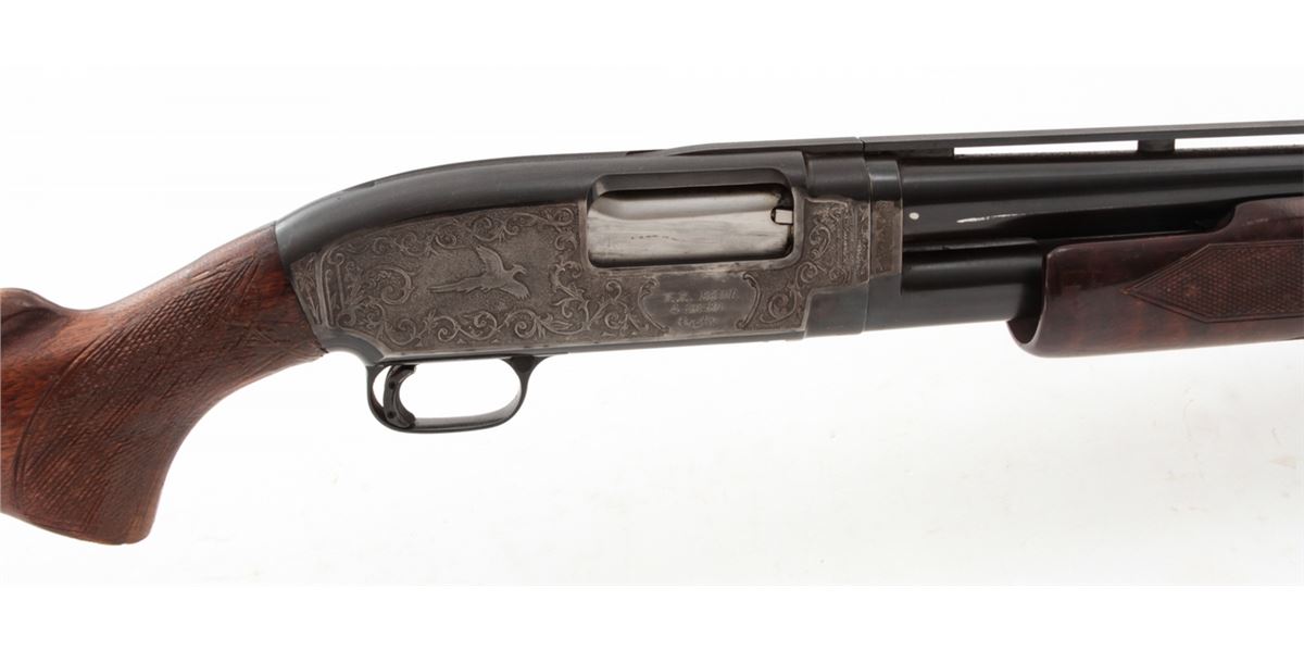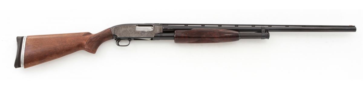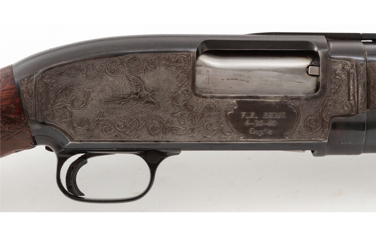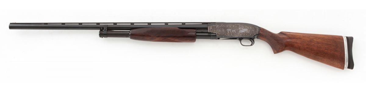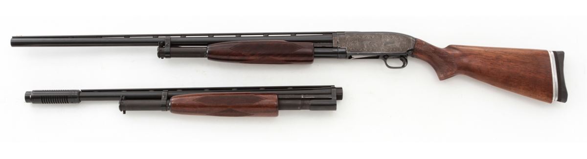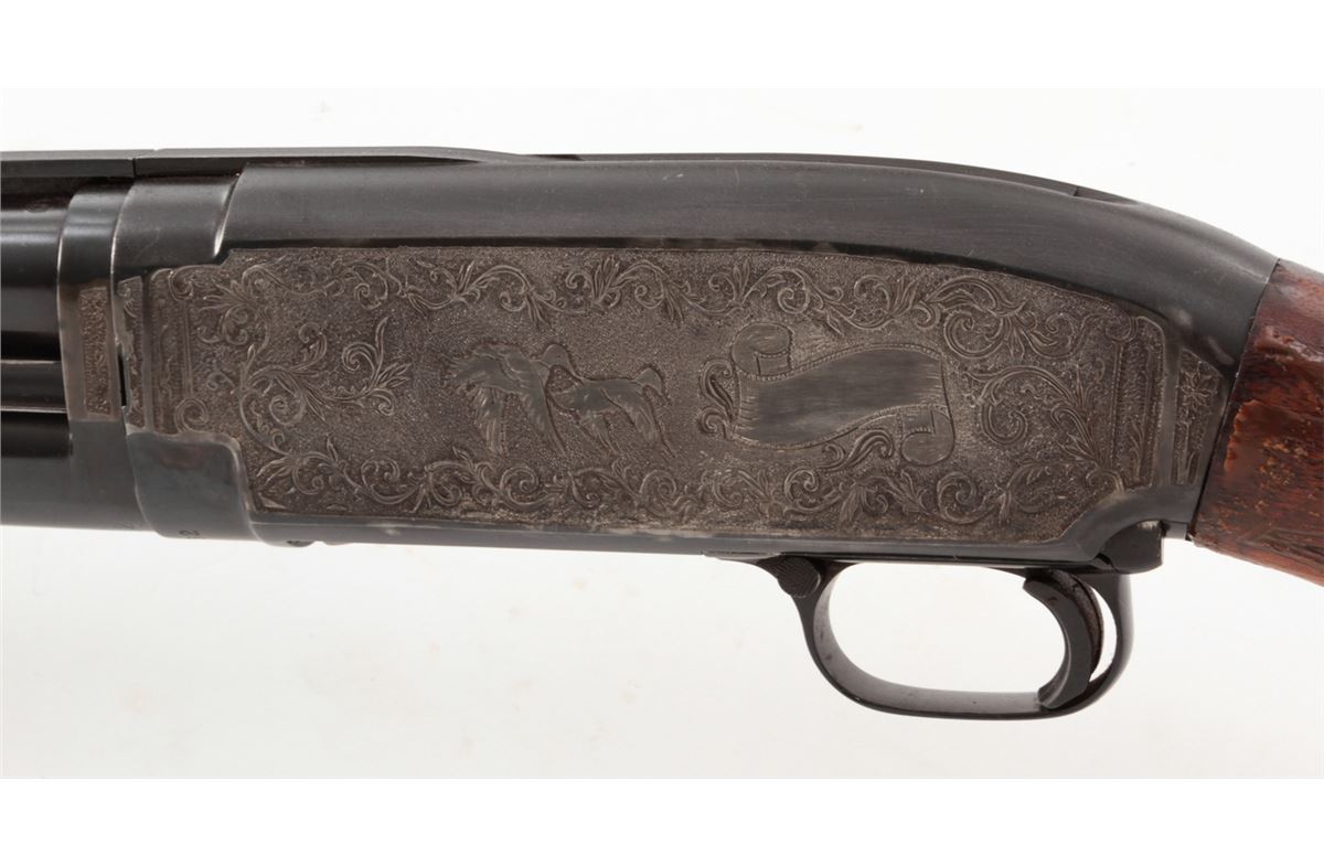 Winchester Model 12 Pump Action Shotgun, with extra barrel, #1494682, 12 ga., 30'' barrel choked Full, and additional 24'' barrel with Cutts compensator, lightly hobbyist engraved blue receiver, Simmons vent rib to both barrels, checkered walnut handguard, and walnut stock with adjustable butt pad. Left side of frame with blank panel for owner's initials; right side additionally inscribed ''F.R. Brown/4-30-80/Eng'r''. Mfg'd 1955. Condition is very good to near fine as refinished and enhanced, retaining approx. 97% immersion type blue. Original stock shows repairs at wrist, additional varnish, and amateur re-tracing of checkers. Action is good, both bores are fine. Est.: $500-$750. (C&R)