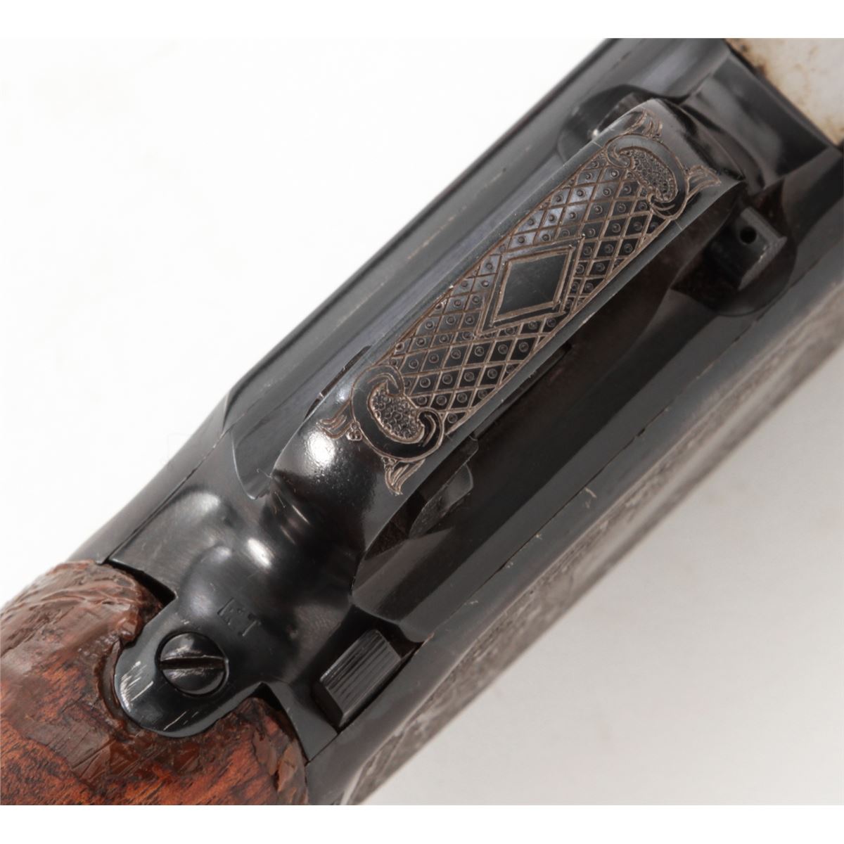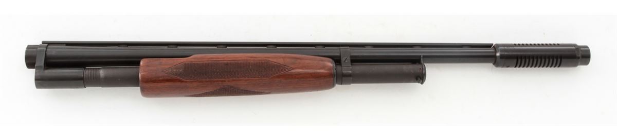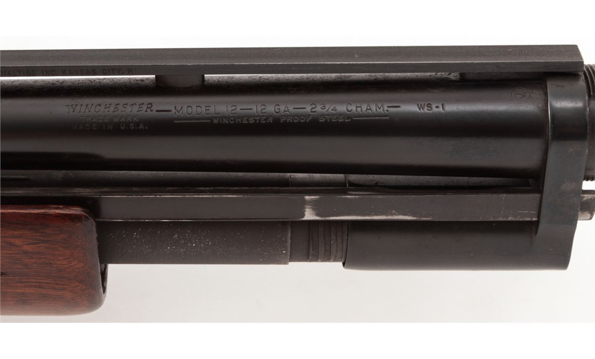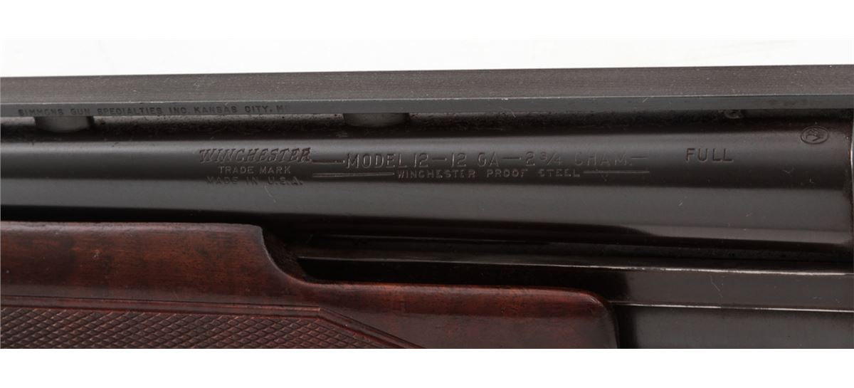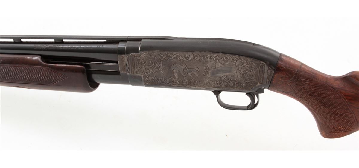 Winchester Model 12 Pump Action Shotgun, with extra barrel, #1494682, 12 ga., 30'' barrel choked Full, and additional 24'' barrel with Cutts compensator, lightly hobbyist engraved blue receiver, Simmons vent rib to both barrels, checkered walnut handguard, and walnut stock with adjustable butt pad. Left side of frame with blank panel for owner's initials; right side additionally inscribed ''F.R. Brown/4-30-80/Eng'r''. Mfg'd 1955. Condition is very good to near fine as refinished and enhanced, retaining approx. 97% immersion type blue. Original stock shows repairs at wrist, additional varnish, and amateur re-tracing of checkers. Action is good, both bores are fine. Est.: $500-$750. (C&R)