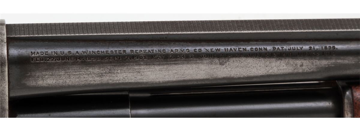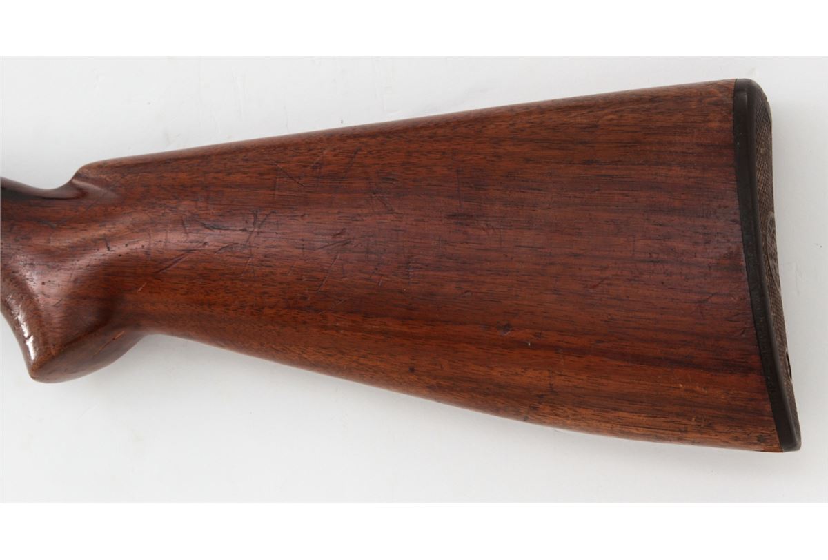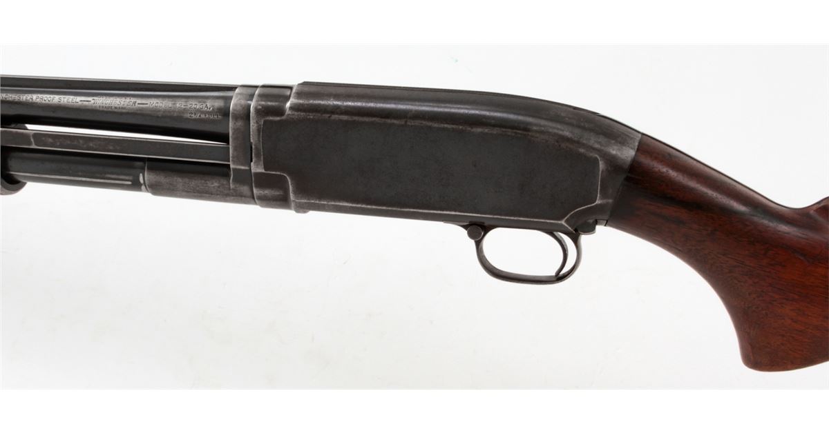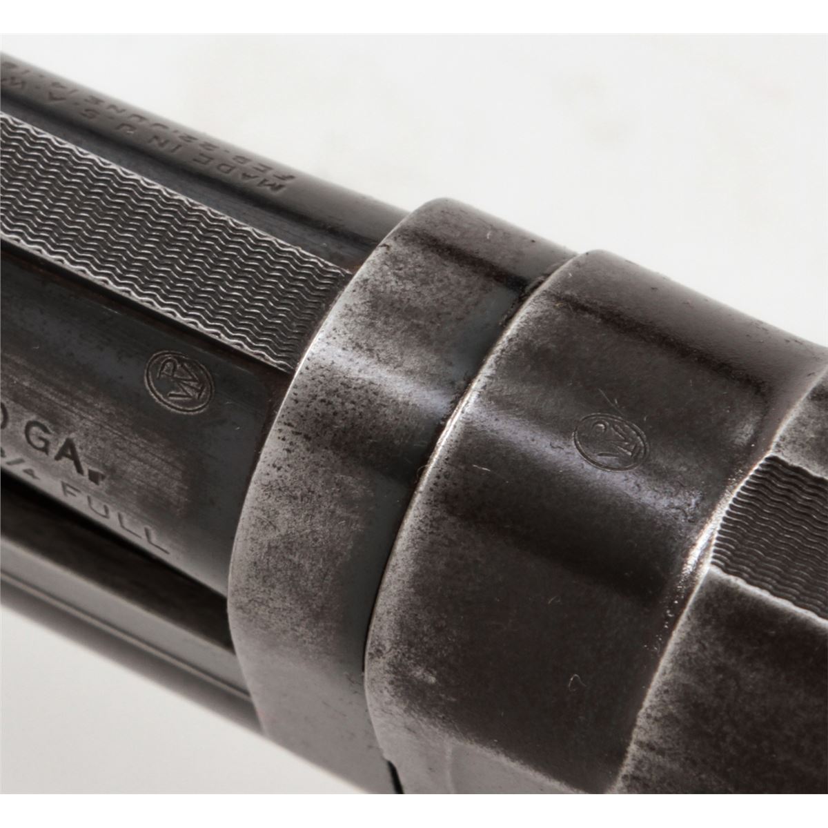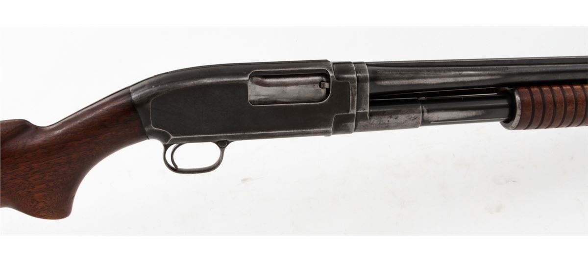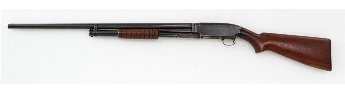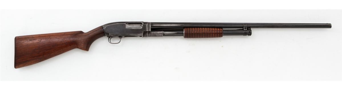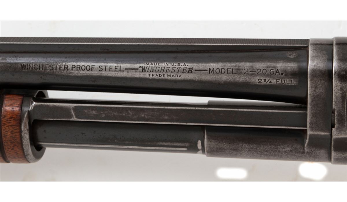 Winchester Model 12 Pump Action Shotgun, #722647, 20 ga., 28'' vent rib barrel with 2-3/4'' chamber choked Full, blue finish, walnut stock and handgun, with factory checkered hard rubber buttplate. Mfg'd 1937. Condition is very good retaining approx. 80%-85% blue with thinning and mild pitting to frame. Stock with moderate scuffs and scratches from field use. Mag plug missing one of its set screws. Action is crisp, bore is bright. Est.: $250-$450. (C&R)