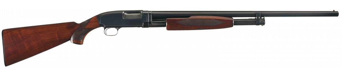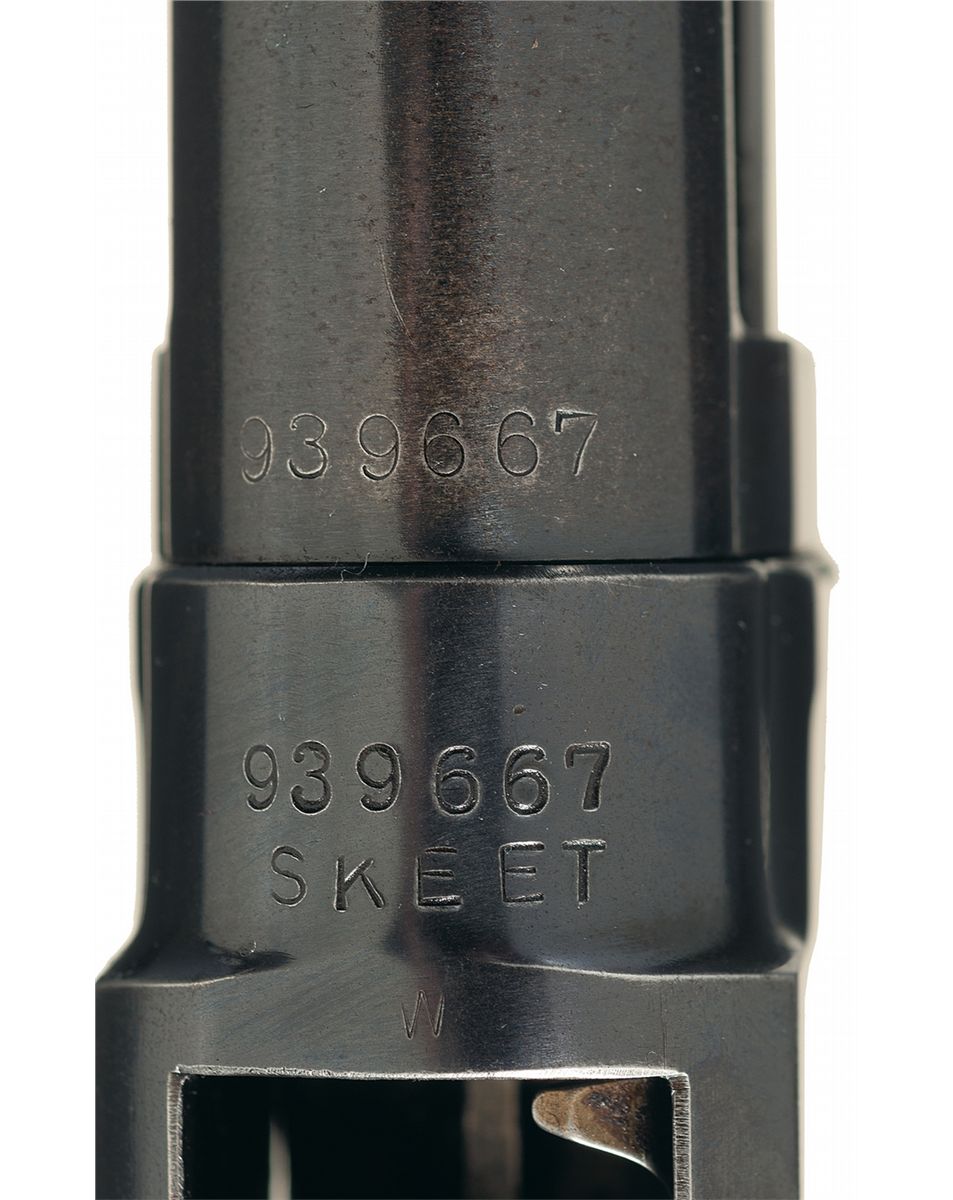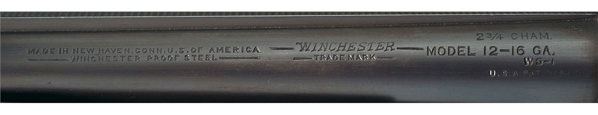 Manufactured in 1942. The barrel has a solid matted rib with red front bead sight, steel mid bead sight, the choke is marked "WS-1/U.S.A. PAT. 2054132" and the chamber is marked "2 3/4". The top of the receiver and the top of the barrel to the left of the rib are stamped with the "W/P" inside an oval proofmark. Mounted on a nicely figured, diamond pattern checkered, extended walnut forearm and pistol grip stock with hard rubber grip cap and buttplate. Length of pull is 14 inches.