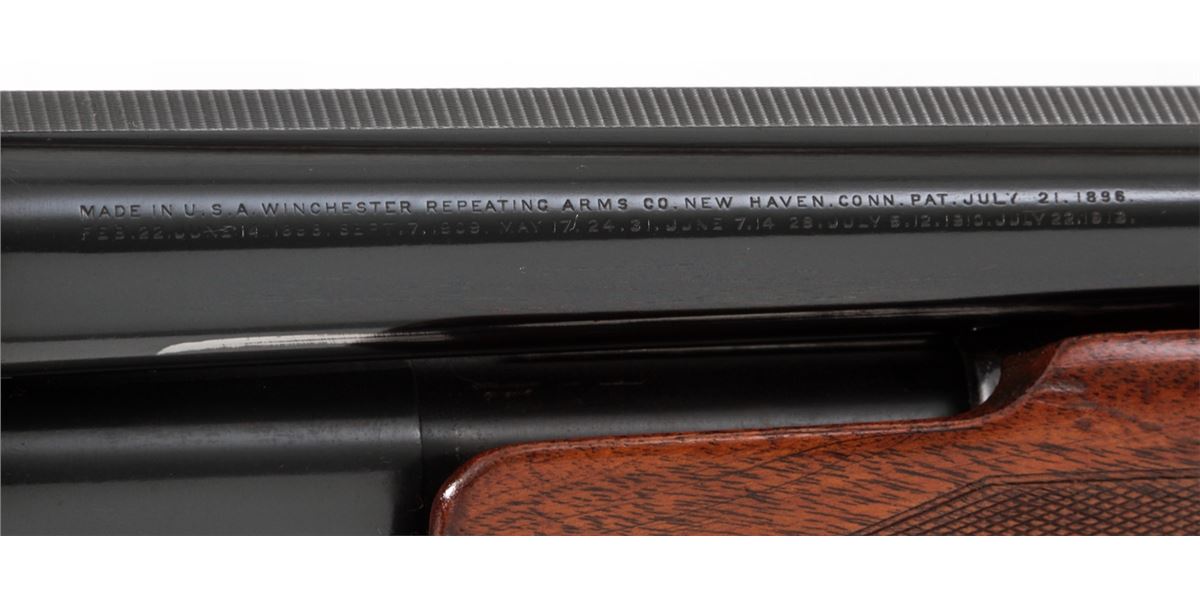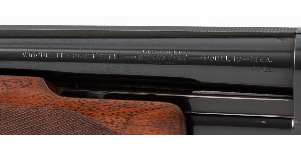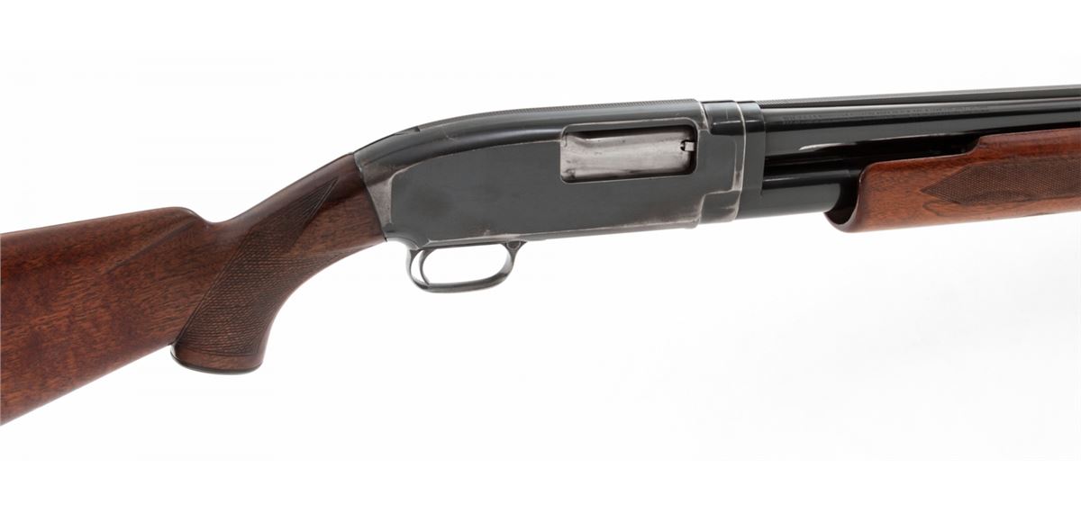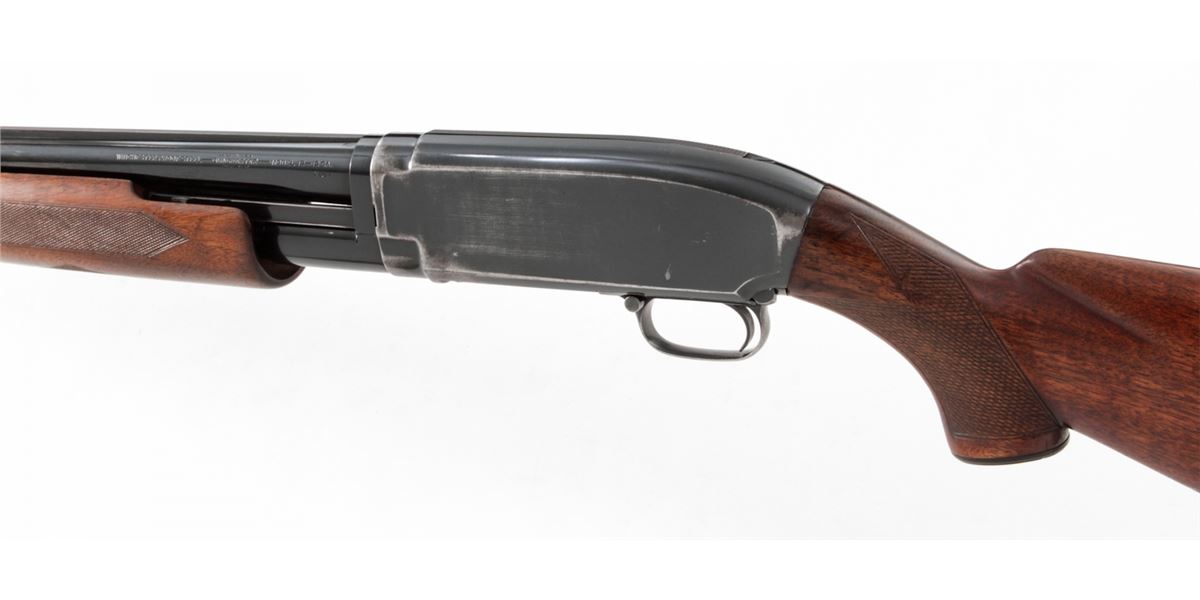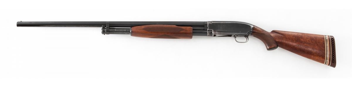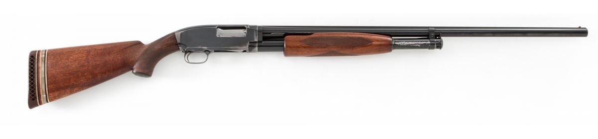 Winchester Model 12 Skeet Pump Action Shotgun, #746769, 12 ga., 30'' Skeet rib barrel choked Full, blue finish, walnut stock with added spacers and Whiteline rubber butt pad. Dual white beads to rib. Bottom of receiver just below serial number marked ''Skeet''. Mfg'd 1937. Condition is very good as partially refinished. Barrel and mag tube show approx. 92% of a later blue. Frame retains 85%-90% thinning original blue. Stock with moderate use and flattening to checks. Length of pull to end of wood: 12''; to end of pad and spacers: 13-5/8''. Action is good, bore is fine. Est.: $250-$450. (C&R)