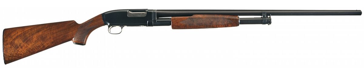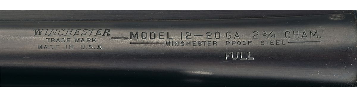 Manufactured in 1954. Single steel bead sight on the solid matte rib. 2 3/4 inch chamber and choked full. Standard markings on the left rear of the barrel, as well as the Winchester oval proof on the upper left rear of the barrel and top of the receiver at the breech. Matching serial number on the bottom of the magazine and takedown ring. Mounted with a checkered highly figured walnut forearm and pistol grip stock with a hard rubber Winchester grip cap and checkered buttplate. Length of pull is 14 1/4 inches.