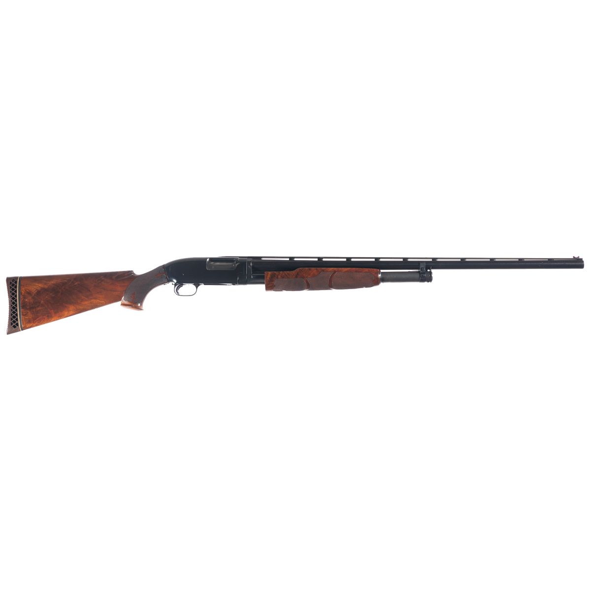 Manufactured in 1955. Simmons vent rib, 2 3/4" chamber, choke marked full and trigger shoe. Replacement stock and forearm. LOP 14 1/2".