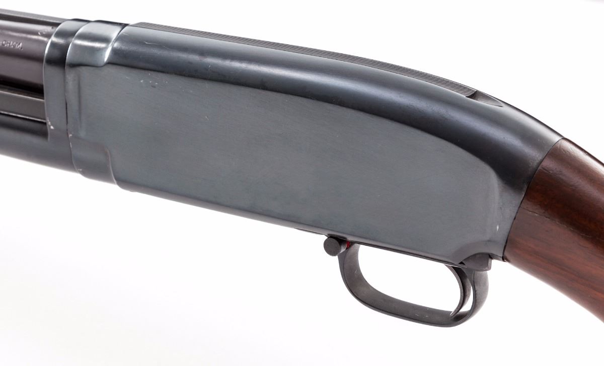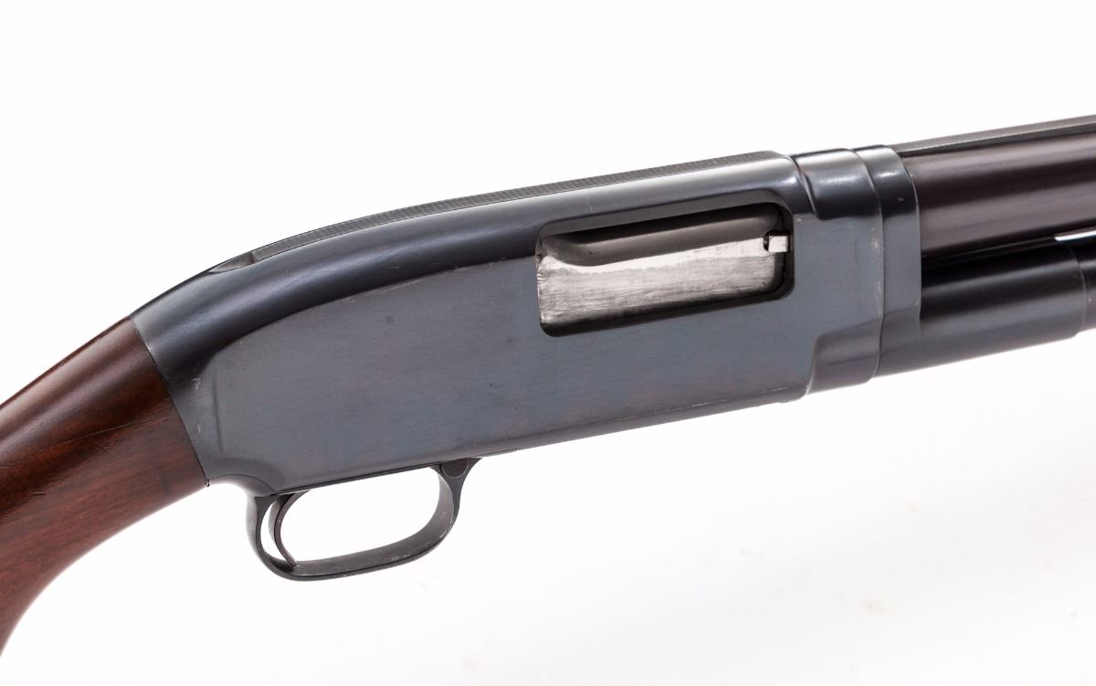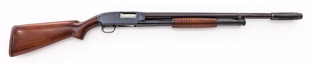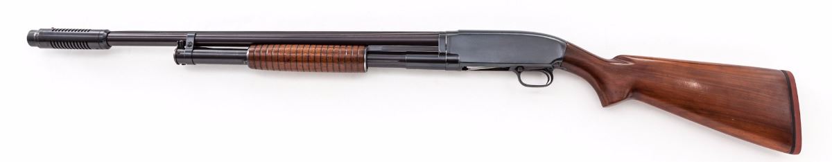 Winchester Model 12 Slide Action Shotgun, with Lyman Cutts Compensator, #939422, 12 ga., 2-3/4'' ch., blue finish, 26'' barrel with 1/4'' matted rib and brass front bead on compensator; barrel retains a Full choke marking; receiver with triggerguard mounted push-button safety; plain pistol-grip walnut stock and grooved handle have a semi-gloss finish with a 14-1/4'' length of pull over a plain 1/2'' solid red recoil pad; weight is 7-7/8 lbs. Mfg'd ca. 1942. Overall condition is very good as modified showing moderate use. Reblued receiver and barrel finishes are approx. 98%, with a few scratches on the receiver, and barrel finish drifting to purple. Receiver and barrel proofs are punch marked and barrel proof is re-stamped. Magazine tube has light corrosion from cycling. Stock and handle have an additional coat of varnish. Action is tight, bore is bright and lightly fouled. Est.: $600-$900. (C&R)