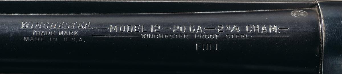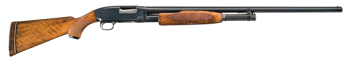 Manufactured in 1959. Single bead front sight on a solid rib, 2 3/4 inch chamber, choked full. Mounted with a checkered extension forearm and pistol grip stock with a steel grip cap and vented White Line recoil pad. The length of pull is 13".