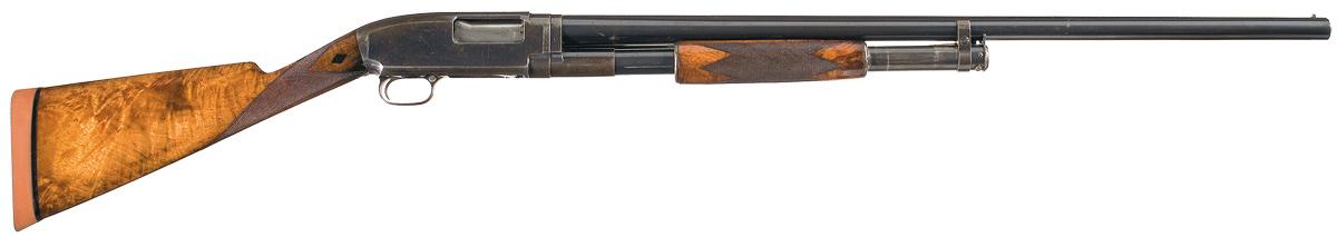 Manufactured in 1915. Ivory bead front sight on a solid matte rib. The left side of the barrel is marked "NICKEL STEEL -[three line Winchester trademark]-MOD.1912-12 GA. FULL" and the right side has the two line address/patent dates marking. The Winchester oval proof is marked on the receiver and barrel. The underside of the receiver is marked "-TRAP-". Fitted with a "Black Diamond" fancy grain checkered straight grip stock with an added solid rubber recoil pad. Length of pull is 14".
