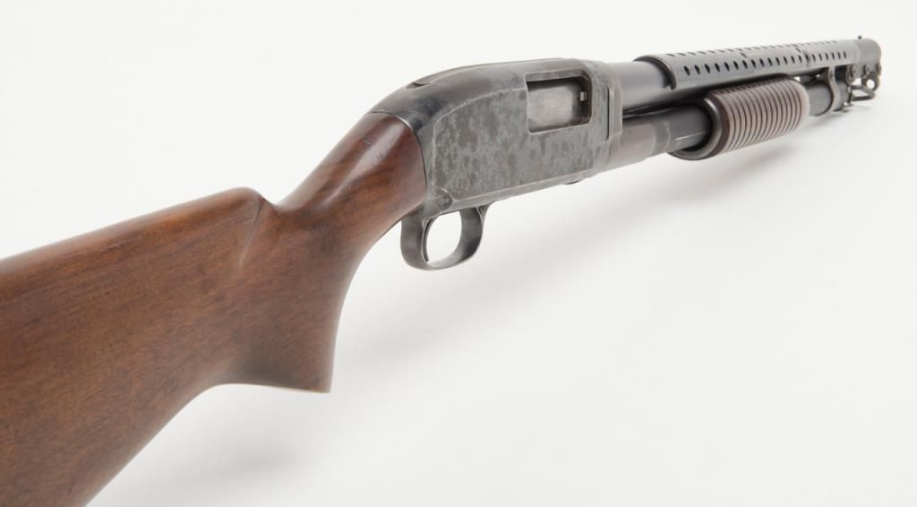 Winchester Model 12 Trench Gun, U.S. marked, numbers mis-matched, #974715 (barrel is 335073); U.S. marks on frame are real and proofed on breech; no marks on stock. (C&R/PPT). Est.: $600-$1,200.