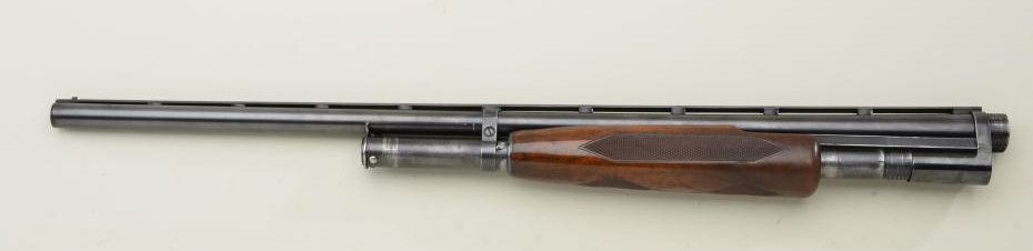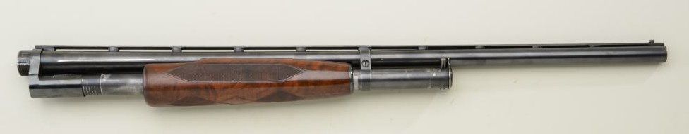 Winchester Model 12 complete front end including barrel magazine, and forend etc. 30" factory ventilated rib, full chocked. Serial #1358671 with pigeon marking. Good to very good. 80-90% blue. Select wood toforend with correct factory style checkering. Good bore, shows some normal use. Est.; $175-$350.