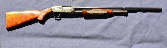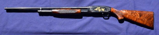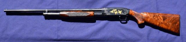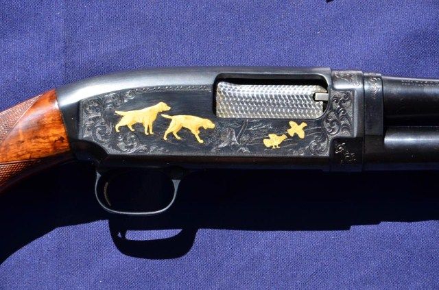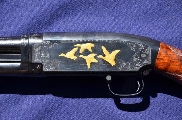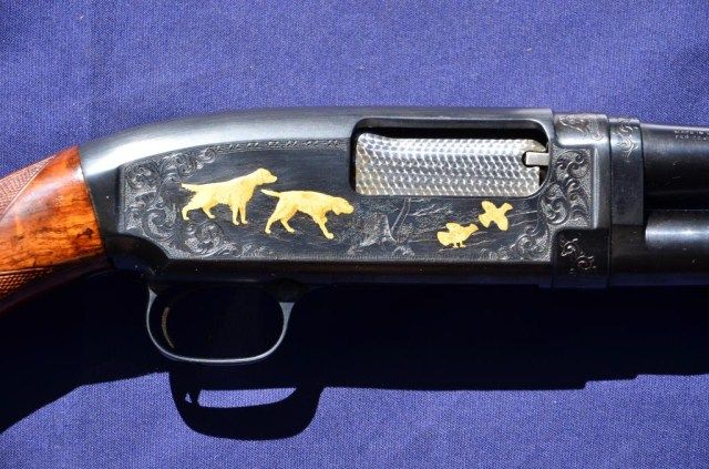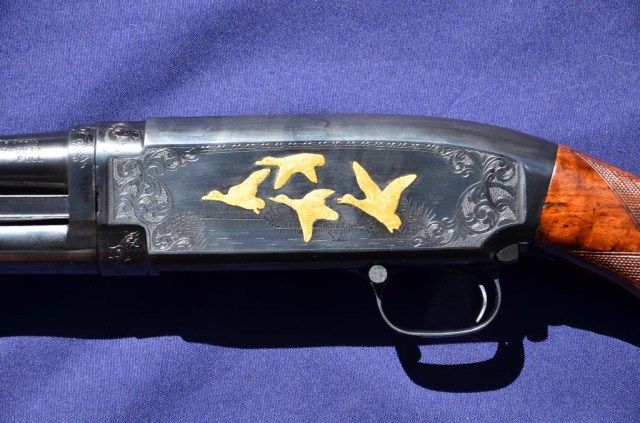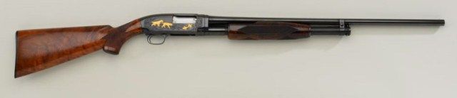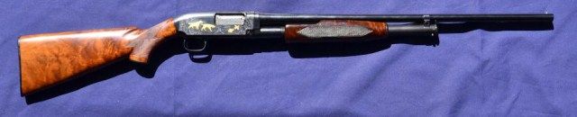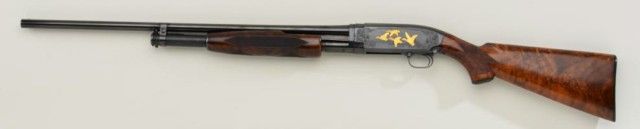 Winchester Model 12 custom engraved and upgraded with conversion to 28 gauge, serial #1234272. The gun shows a 26” barrel marked full choke with deluxe checkered wood stocks in factory influenced pattern. The frame has been engraved and is gold inlaid with 4 large ducks on left and hunting dogs flushing game birds on right with scroll and border engraving. The bolt and follower have been engine turned. The quality of theconversion, remarking, engraving, gold inlay and restocking is all good. The gun remains in fine condition since refurbish with 98-99% blue near excellent stocks showing slight storage and minor use. Est.: $2,250-$4,500.