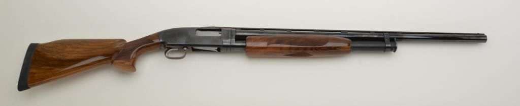 Winchester Model 12 pump action WS-1 takedown shotgun, 12 gauge, 2-3/4” chamber, 26” ventilated rib barrel, deluxe re-stocked checkered wood with Decelerator hard rubber butt pad, #1926045. This gun is in overall very good to fine condition as customized with added rib, quality re-finish, release trigger, bore should clean to near fine, beautiful deluxe finely grained wood stocks. Est.: $500-$1,000.