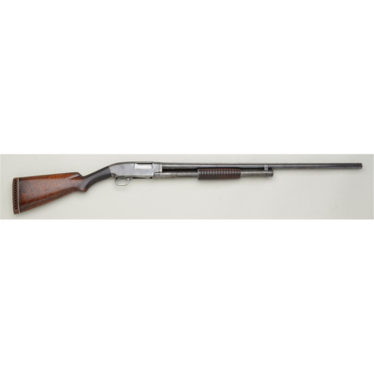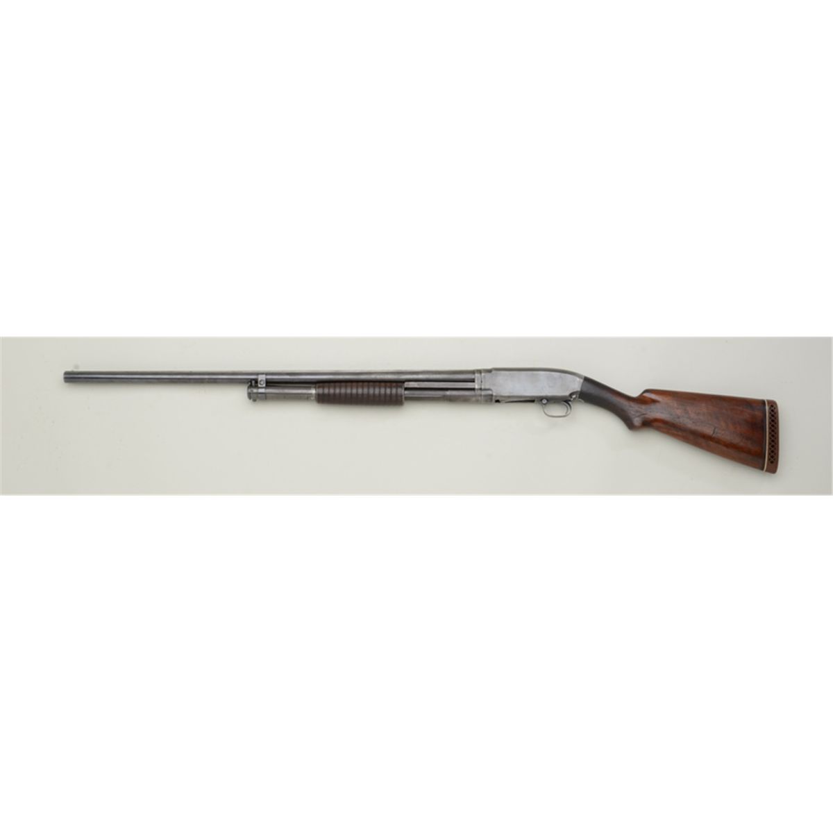 Winchester Model 12 pump action shotgun, takedown feature, 16 gauge, modified choke, 28’ barrel, blue finish, wood stocks, #438013. This gun is in overall very good to fine condition showing approx. 65% originalfinish, very good action, bore should clean to very good; very good wood stocks with after-market White Line hard rubber butt pad. Est.: $250-$500.