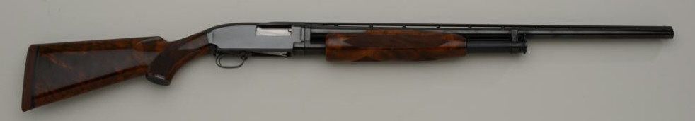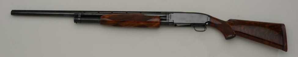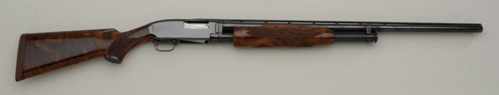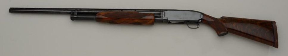 Winchester Model 12 pump action takedown Skeet shotgun, 12 gauge, 2-3/4” chamber, 28” barrel with Simmons style ventilated rib, re-blued finish, deluxe checkered wood stocks with hard rubber butt pad, #1347483. Thisgun is in overall very good to fine condition as upgraded with a fine bore, crisp action, approx. 97% re-finish present and beautifully grained custom wood stocks with a length of pull of 14-1/4”. Est.: $600-$1,200.