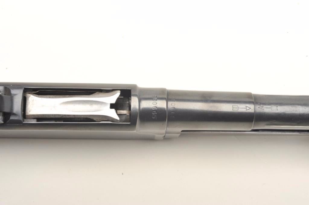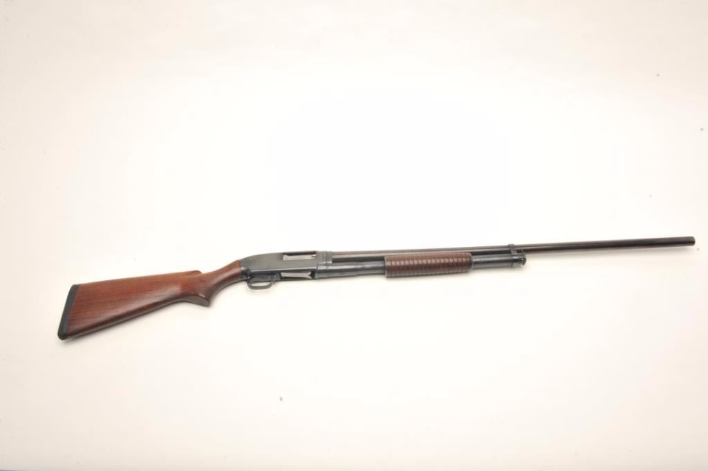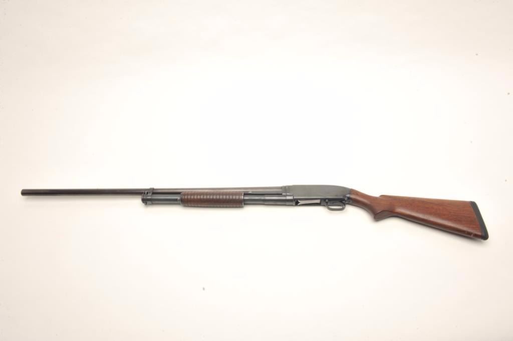 Winchester Model 12 pump shotgun, 12 gauge, serial #900665. The shotgun is in very good overall condition with a 32” barrel with steel bead front sight. The barrel retains nearly all of its re-blued finish with slight muzzle wear noted. The shotgun for Super 3” Mag. The receiver has a light freckling of surface rust on the right side while it retains the majority of its blued finish. The checkered wood stocks are in very goodcondition showing only light handling marks. The butt stock ends with a black rubber recoil pad and a 14 1/2” LOP. The bore is good, the action crisp and markings are sharp. Est.: $350-$700. (C+R).