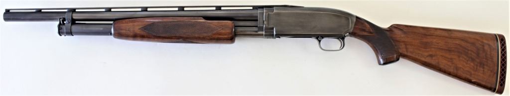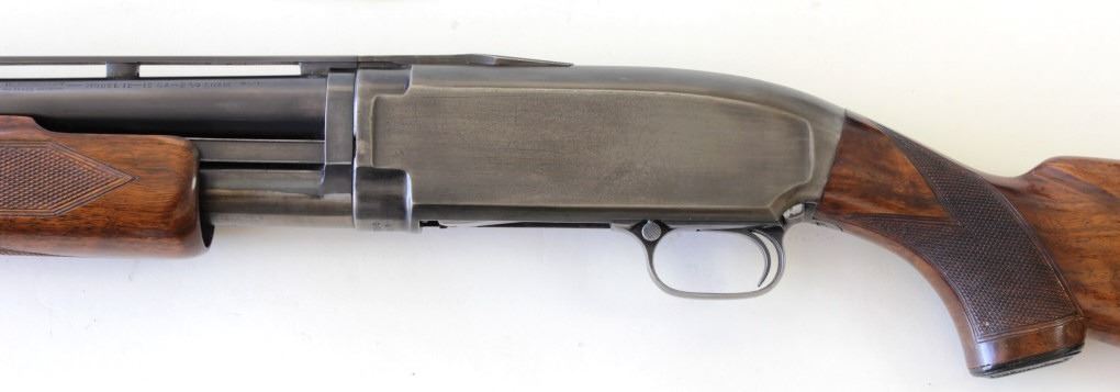 Winchester Model 12 skeet 12 ga. SN 865783 pump action shotgun with shortened 20 3/4" vent rib barrel and checkered walnut stocks. Good as altered receiver shows gray overall patina thinning blue on right side, walnut stocks recleared with NO cracks or rpump action shotgun with shortened 20 3/4" vent rib barrel and checkered walnut stocks. Good as altered receiver shows gray overall patina thinning blue on right side, walnut stocks recleared with NO cracks or repairs. Actionsmooth, bore mirror bright. Made in 1941. From old St. Louis collection. FFL/Modern. Est. 250-400