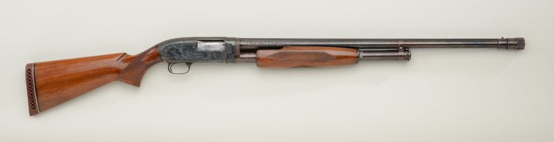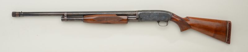 Winchester Model 12 takedown pump action shotgun, after-market engraved, 12 gauge, 27-1/2” nickel steel barrel including adjustable muzzle poly choke, blue finish, checkered wood stocks with red hard rubberbutt pad, #278512. This gun is in overall very good condition with a very good to fine bore, crisp action, very good wood stocks and tasteful engraving that covers the receiver and breech end of the barrel; there are fiveseparate game scenes of birds and hunting dogs that are well proportioned and expertly accomplished; a nice early Model 12. Est.: $350-$700.