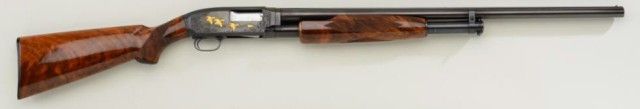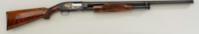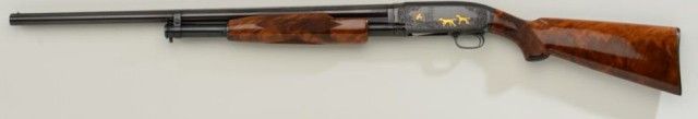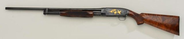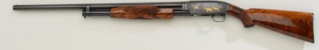 Winchester Model 12 upgraded and engraved 12 gauge 2 barrel set, serial #1567103. The gun shows a factory styled grade 5 pattern engraving and gold inlay showing pigeon engraved above serial number on magazine tube with custom deluxe burl wood stock in factory influenced checkering pattern. The first barrel measures 28” with raised non ventilated rib and is marked full choke (now measures improved modified to full). Thesecond set of barrels come with a matching fore end, measure 26” and are choked WS1 with matching non ventilated rib and serial numbered to match. The gun has been refurbished to excellent condition and is98-99% overall with near fine wood. The quality of the upgrade and engraving is very good. The stock measures 14-3/8” to the end of the factory butt plate, 2-1/2” drop at heel and 1-1/2” drop at comb. Est.:$2,000-$4,000.