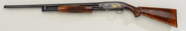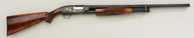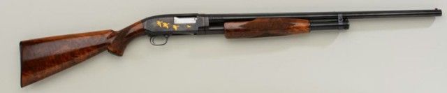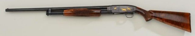 Winchester Model 12 upgraded and engraved 20 gauge 2 barrel set, serial #136077. The gun shows a factory grade 5 pattern and gold inlays with pigeon engraved above serial number on magazine tube. The stock is select burl wood in a factory influenced pattern with Winchester pistol grip cap and hard rubber butt plate. The first set of barrels measures 26” with raised non ventilated rib and full choke marked barrel for 2-3/4”shells. The extra barrel shows a matching fore end measuring 25” and is choked WS2 (skeet) with matching non ventilated rib and also pigeon marked with matched serial number. The refurbish, upgrading andremarking are all well done. The gun retains 98% plus of its correct color refinish. The stock measures 14-1/2” to the end of the butt plate, 2-7/8” drop at heel and 1-7/8” drop at comb with no cast. Est.: $1,750-$3,500.
