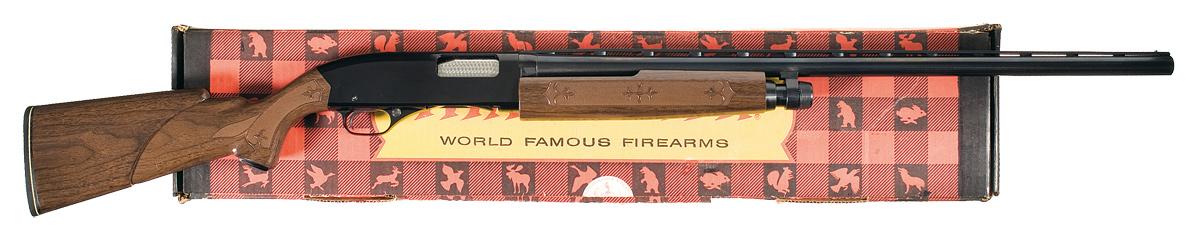 Condition: The shotgun retains virtually all of the original blue finish with only the magazine end cap showing some minor spotting. The stock is excellent with only light handling marks. Box is very fine with some tears.