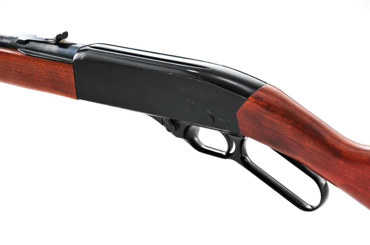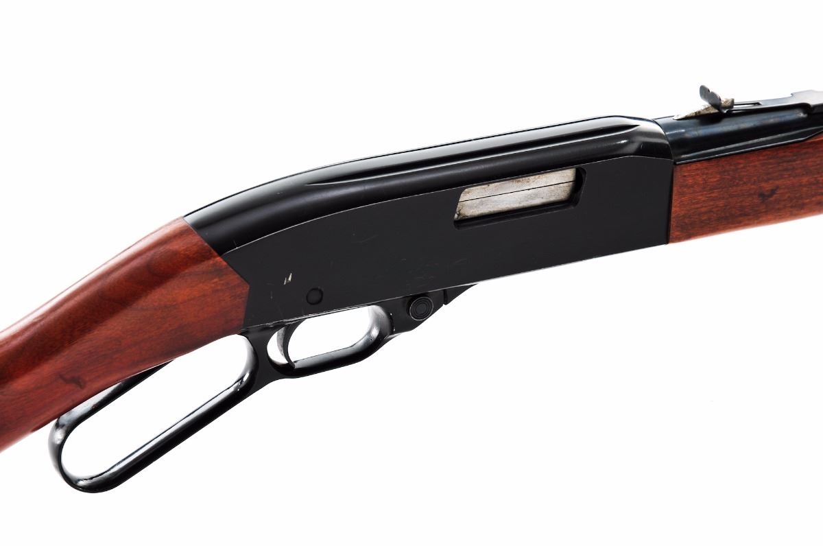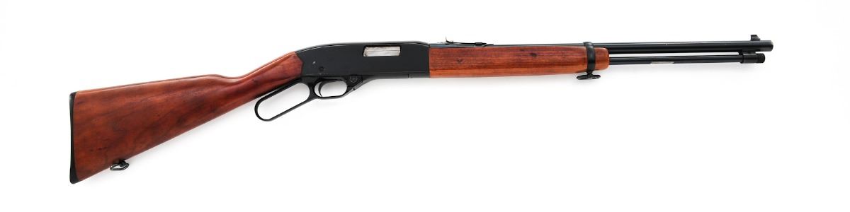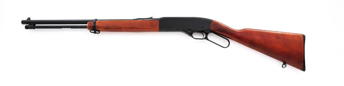 Winchester Model 150 Lever Action Rifle, #545010, .22 S-L-LR cal., 20'' blue barrel, black receiver, smooth straight hardwood stock and forend, silver bead front sight, notched rear sight with handmade replacement elevator, factory black plastic Winchester buttplate, and sling swivels.  Condition is good retaining approx. 90% blue/black finish with general moderate scratches, as well as scattered fine surface rust to the barrel and a few larger patches near the muzzle.  Stock with overall light to moderate scuffs and impressions.  Action is crisp, bore is excellent.  Est.:  $125-$250.  (Modern)