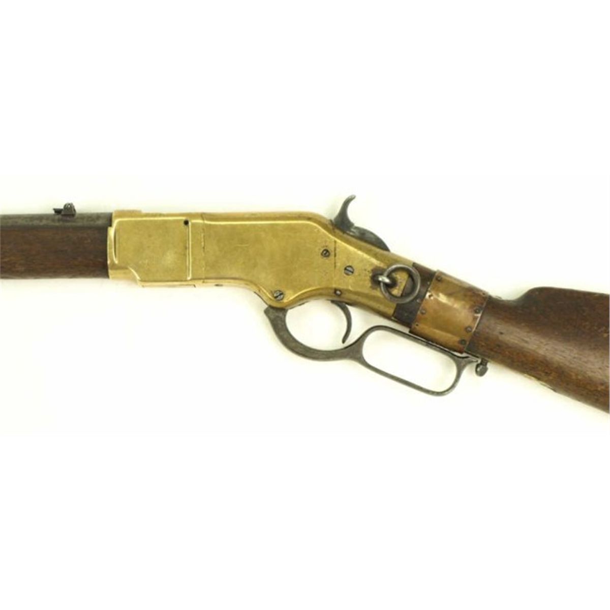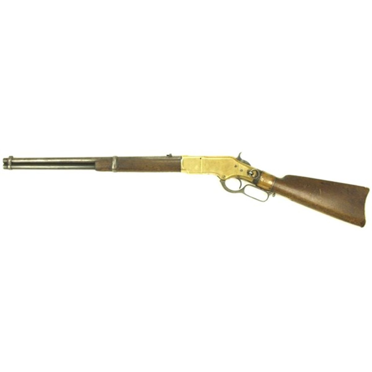Winchester Model 1866 .44 cal. SN 130598 lever action carbine standard 20' barrel, walnut stocks, barrel and magazine tube show silver gray to brown patina, mag with generous blue in protected areas, receiver a nice old mellow patina, original brass carbine butt intact, rear walnut stock with old copper wrap repair done in the period as well as nailed and tacked repair to crack at the comb extending to almost the end of stock. Rifle with smooth action, fair bore. Well used but honest 66 with loads of character. Mfg'd 1876, NO FFL required.