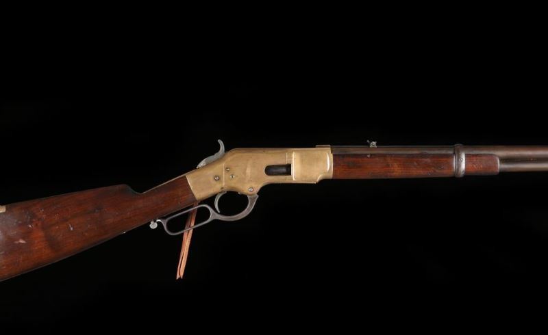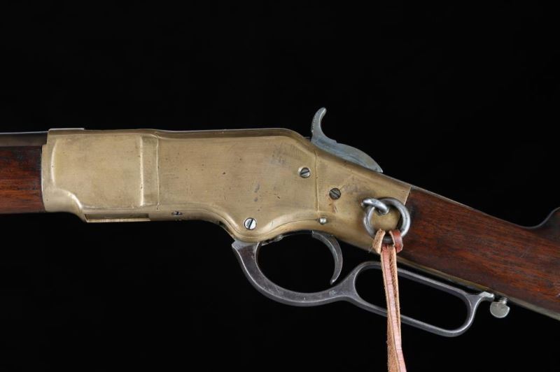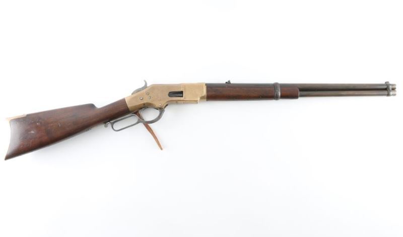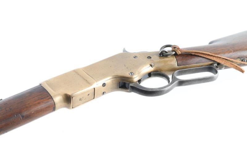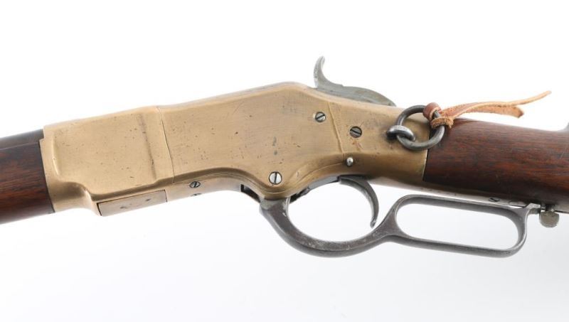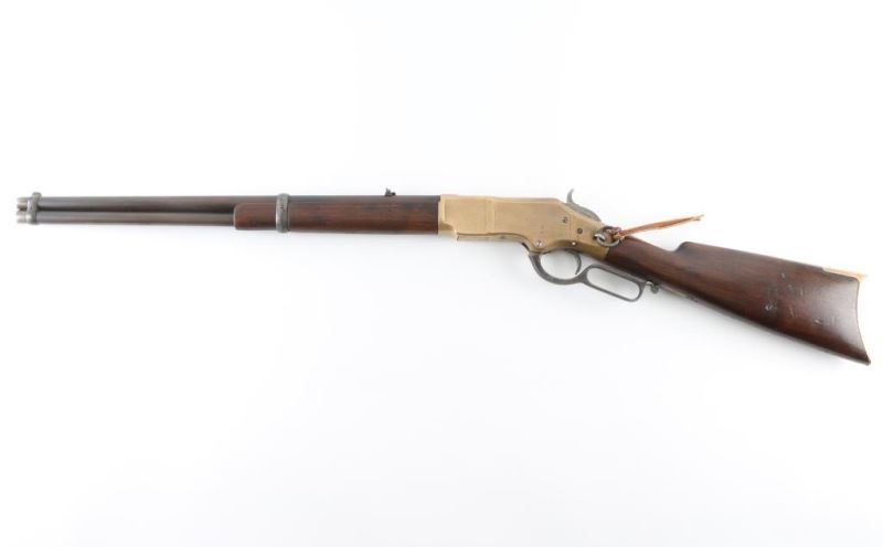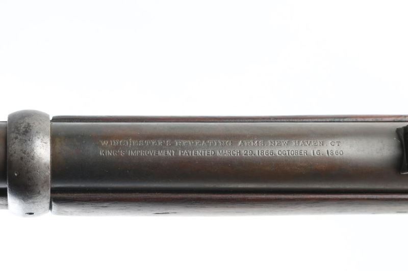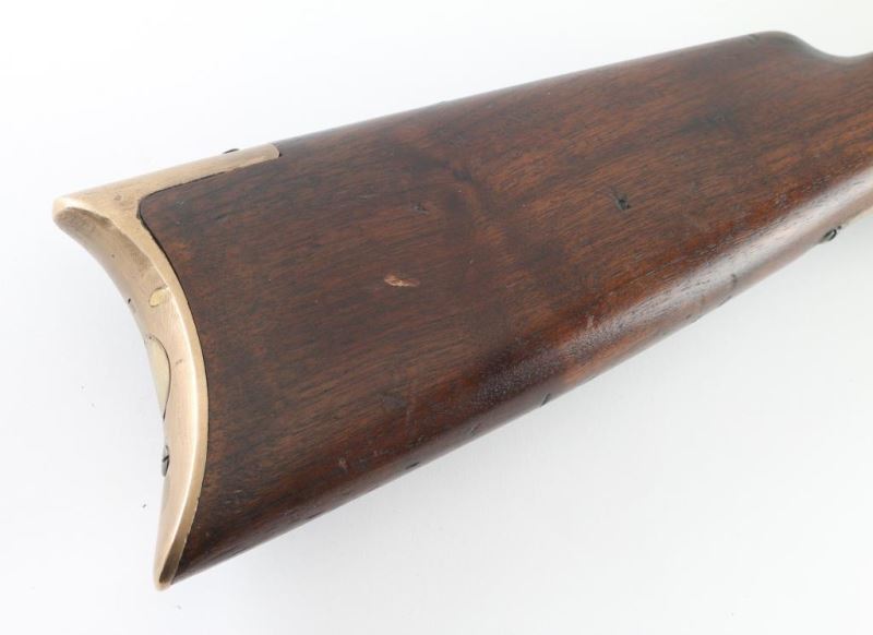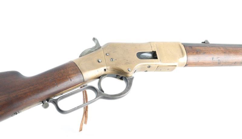 ***Deactivated*** '3rd Model' Saddle Ring Carbine manufactured circa 1871. Features brass receiver, other metal parts blued, smooth wood furniture, 20" round barrel, full length magazine tube, blade front sight, "L" flip rear sight, lever latch, brass crescent buttplate with storage trap. Bore is fair to good condition, good rifling with dark grooves, frosted throughout. Barrel and mag tube are brown color, fairly smooth texture. Lever is dark gray color. Brass parts retain darker patina color, with small dents and other signs of use. Wood is good condition, dented and scratched, lightly varnished. Bolt face shows a raised circular protrusion with some marring or tool marks, appears to be the firing pin body protruding slightly beyond the replaceable head portion. Left protrusion of firing pin head broken / missing. Firing pin altered (shortened? or improperly assembled or installed?) so hammer hits frame, not the firing pin. Not capable of firing as modified, should be correctable, might just need cleaning and proper re-assembly.