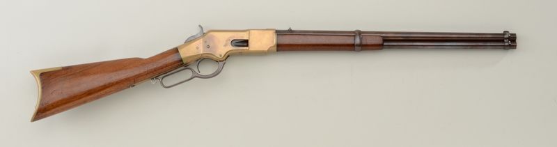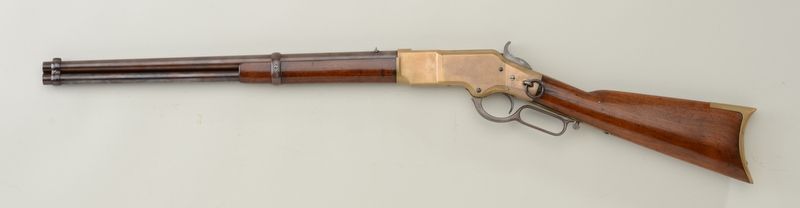 Winchester Model 1866 lever action SRC, Henry’s Patent-marked 20” barrel, .44 cal., brass frame, wood stocks, #15374. This early ’66 is in overall good condition showing an old browned finish to the barrel and loadingtube, good action, fair bore, overall good wood butt stock and fore end that have an old re-finish; a classic old “yellow boy”. Est.: $3,000-$6,000.