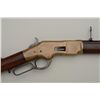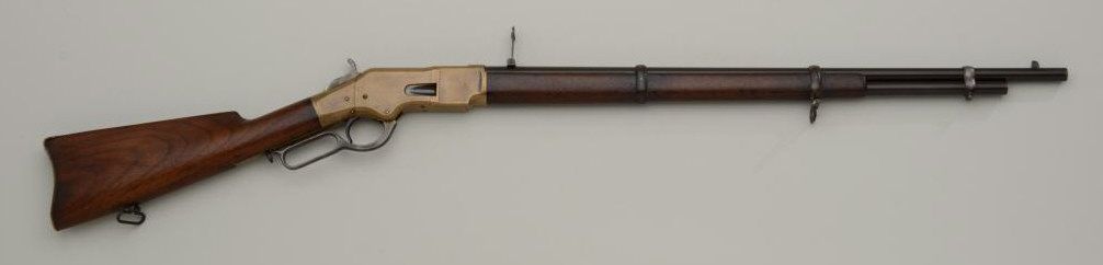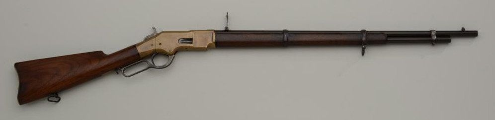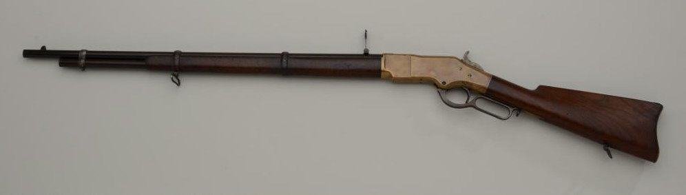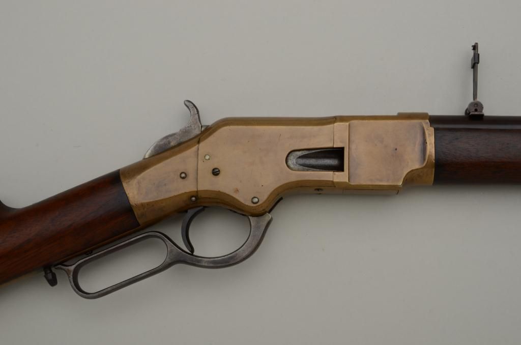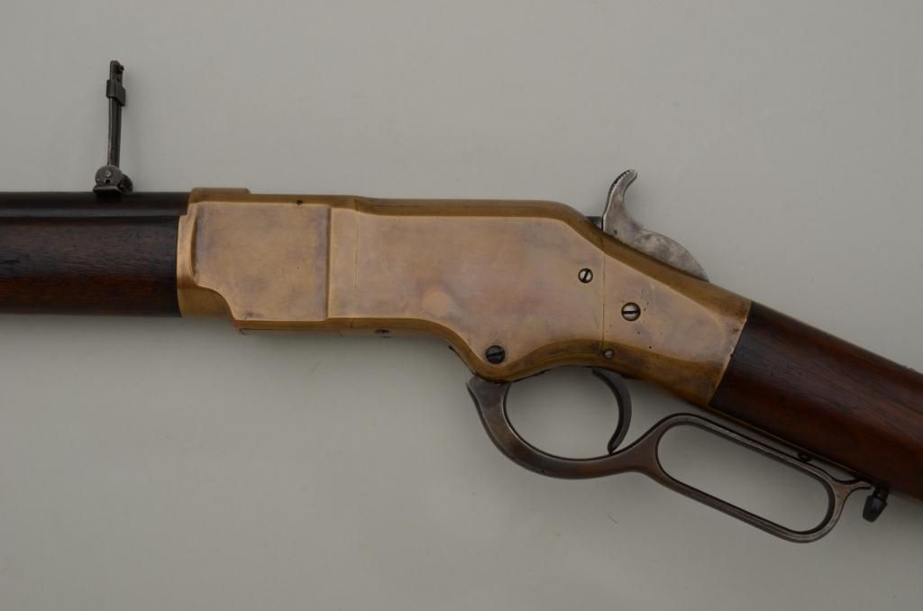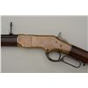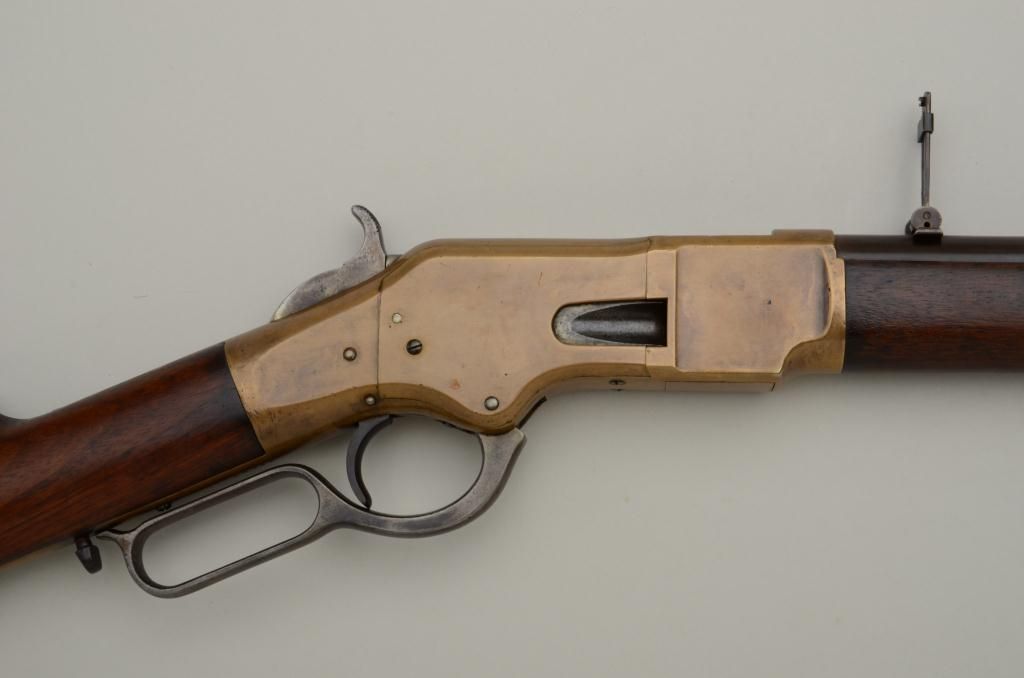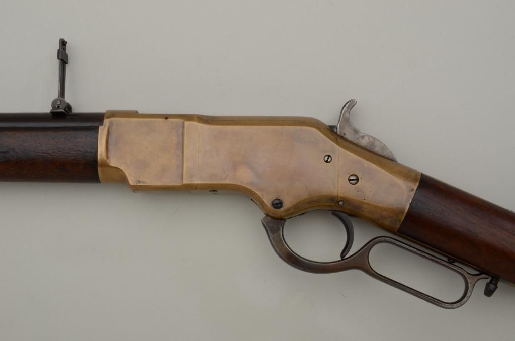 Winchester Model 1866 lever action musket in .44 rimfire caliber serial number 76189. This model 1866 remains in original very good condition with a pleasing light Brown patina on the barrel and magazine tube showing somefaint traces of blue mixed in. The barrel address is fairly sharp and metal surfaces show just some minor areas of pitting and erosion. The frame shows a light patina with good edges and well fitting side plates withalmost no nicks or dents. The hammer and lever show traces of colors going to Brown. The stocks have been lately cleaned and are very slightly undersized and are at least good to very good condition. The originalrear sight is retained and there is a trace of blue on the loading gate. Action is good and the bore is very good and still bright. Est.: $2,500-$5,000.