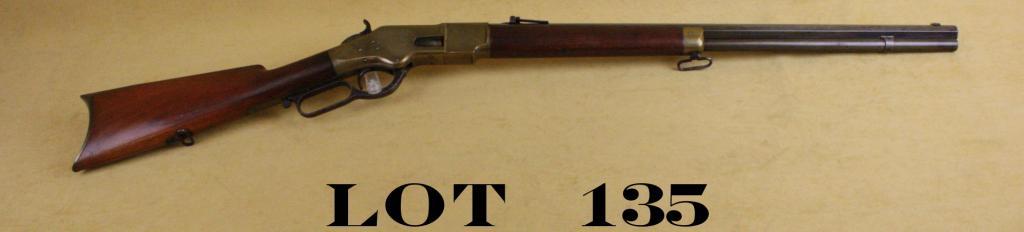 Winchester Model 1866 lever action rifle, .44 cal., 24” octagon barrel, brass frame, blued barrel assembly, wood stocks, #121818. This gun is in overall good condition showing a light patina on the receiver, barrel assembly has a brown patina overall with sharp barrel address; bore is fair to good, action is good and wood stocks are good showing some scattered nicks and mars from carry and storage; both sling swivels are retained.Est.: $3,000-$4,000.