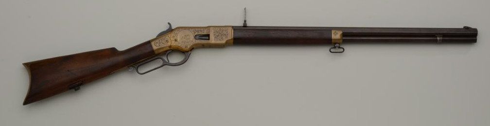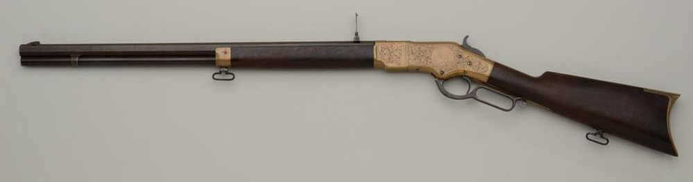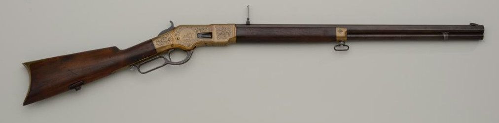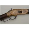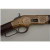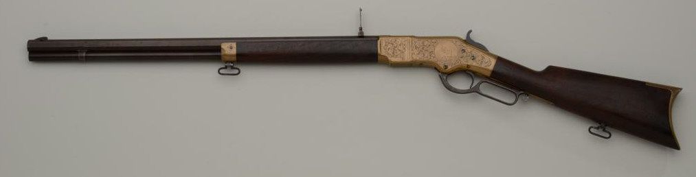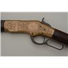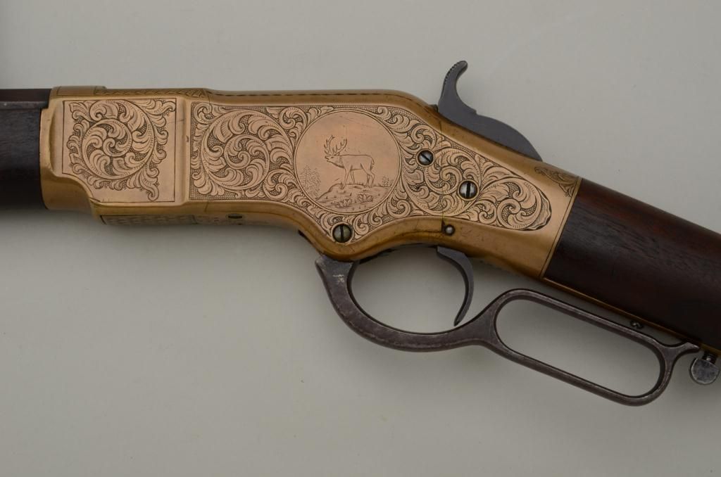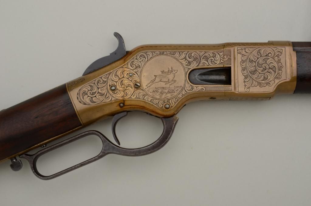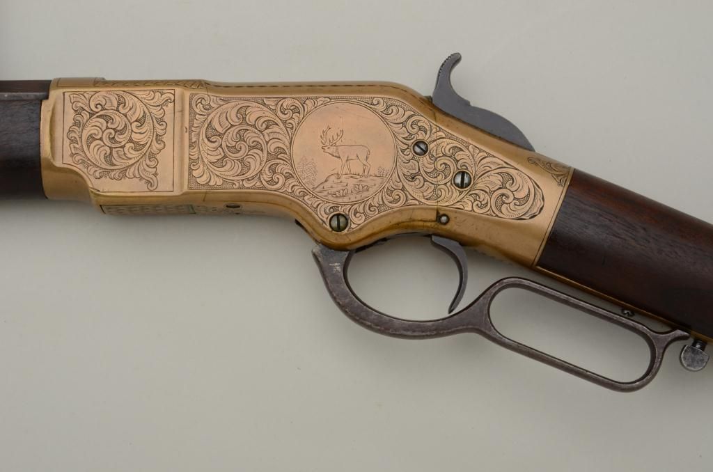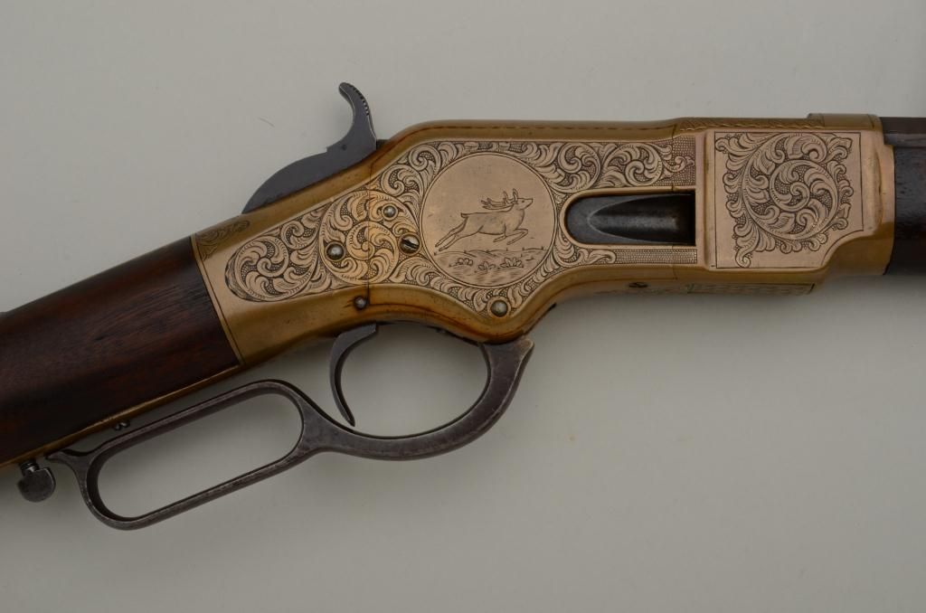 Winchester Model 1866 lever action rifle in .44 rimfire caliber custom engraved in modern times using 19th-century style scroll and pattern. Serial number 125024.The engraving on this Winchester is a very close simulation probably by RL Barnard who worked for Ron Kudrick in the Carson City area where this rifle was purchased of more than 20 years ago. The barrel and magazine tube show strong traces of original blue mixed with a brownand retaining a sharp barrel address in good edges. The loading gate shows a faint trace of original blue. The stocks have been lightly cleaned and are at least very good. The rifle retains original to the periodsling swivels and correct sights. The action is good and the bore is fair to good. And attractive looking 1866 rifle which is much closer to original style engraving than many we see offered for sale on the collectorsmarket everyday. Estimate $4,000-$8,000.